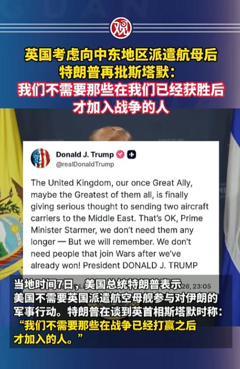 仗快打完才想来分一杯羹?特朗普当众给英国“下绊子”,百年盟友情分彻底撕破脸,这波操作太现实。 昨天特朗普在社交平台上公开炮轰英国首相,一句话把美英之间吹嘘了上百年的“特殊关系”,扒得底裤都不剩。 这事得从美以对伊朗的军事行动说起,2月28日美以联军发动空袭,中东局势瞬间拉响最高警报。 一开始斯塔默的立场特别硬,绝不掺和进攻性行动,还直接拒绝了美军使用迪戈加西亚等英国基地的请求,嘴上说着要遵守国际法、吸取伊拉克战争的教训,实则不想引火烧身。 直到3月1日眼看局势越闹越大,斯塔默才松了点口,允许美军把英国基地用在“有限的防御目的”上,说白了就是不想彻底得罪美国。 可就在仗打了快一周、美军对外宣称“已经稳操胜券”的时候,英国突然来了个180度大转弯,宣布要把“威尔士亲王”号航母的战备时间从10天压缩到5天,甚至琢磨着派两艘航母去中东。 这谁都能看明白,英国这是想在局势尘埃落定前,赶紧到中东刷一波存在感,保住自己在当地的石油利益和话语权,说白了就是想“摘桃子”。 没想到特朗普一点面子都不给,直接发文“打脸”:“英国,我们曾经最靠谱的盟友,现在才想起来派航母去中东,行吧斯塔默首相,我们已经不需要了,我们可不需要那些等我们赢了才来参战的人。” 甚至他还吐槽斯塔默在基地使用问题上“磨磨蹭蹭太久”,直言自己“非常失望”。 其实这事儿根本不是“帮不帮忙”的小事,而是美英之间利益算计的彻底暴露,特朗普要的是“召之即来”的小弟,在他眼里英国前期犹豫、后期“补刀”,就是不够忠诚的表现。 而斯塔默夹在国内反战情绪和美国压力之间,想走“有限参与”的中间路线,结果两头不讨好。 说白了,这场风波就是百年“英美特殊关系”的现形记:没有永远的盟友,只有永远的利益。 当美国觉得自己能搞定一切时,曾经喊着“血浓于水”的亲密伙伴,也会被当成“多余的人” 一脚踢开。 信息来源:观察者网 2026年3月8日报道