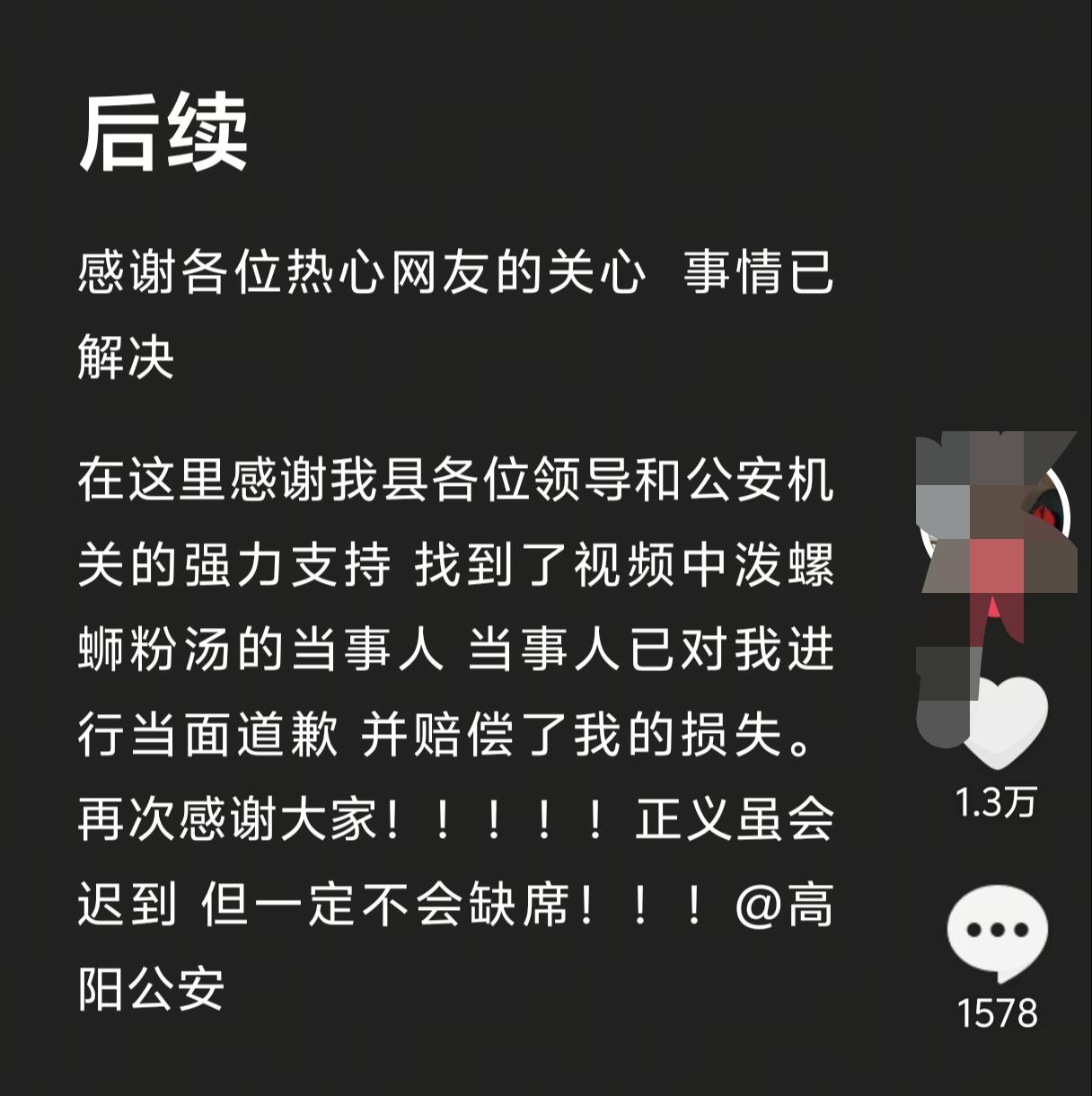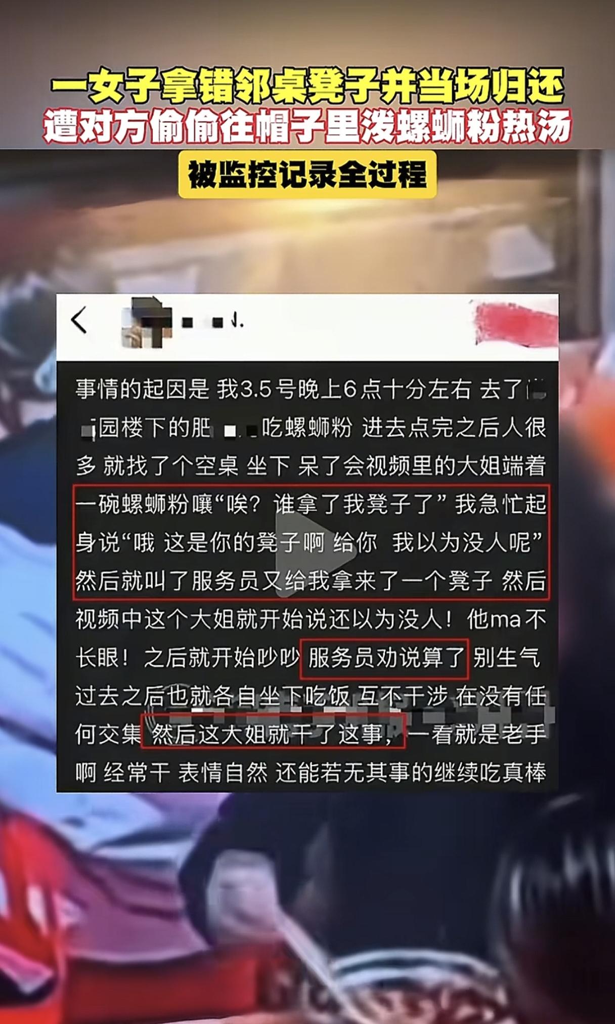 泼螺蛳粉汤的女子已经找到,并且当面对粉衣女子道歉了!但让我想不到的是,原来黑衣女子对面坐的不是朋友,而是她的女儿,也就是说她这一恶劣的行为是当着女儿面做出来的! 3月5日晚,河北保定一女子来到螺蛳粉店内就餐,当天人比较多,女子找了个没人的桌子坐了下来,却没想到拿错了凳子,凳子是邻桌的。 随后粉衣女子友好的把凳子归还,可黑衣女子却不依不饶,两人发生争执后被服务员拉开,然后就各自吃饭没有交集。 没想到黑衣女子却气不过,偷偷将碗里的螺狮粉汤汁用勺子泼洒在粉衣女子的帽子里,表情自然,若无其事的样子! 当时邻桌一位正在就餐的男士也看到了,顿时傻了眼,表情都呆住了,毕竟能做出这种事的人还是很少见的! 而且黑衣女子对面坐的还是她的女儿,身为一个母亲,不给女儿起榜样带头作用,反而做出这么恶劣的行为,真是一点也不计后果啊! 现在女子已经被找到并当面道歉,估计她不是怕了,而是因为这件事在网上发酵了,迫于压力才道歉的。 这个结局也算解气,毕竟她的同事、家人应该都会看到新闻,也算真正看清了她的为人,还给自己女儿丢了脸,真是亏大了! 人和人之间难免会有些小摩擦,何况粉衣女子也不是故意的,得饶人处且饶人吧,何必那么斤斤计较! 黑子女子的报复心太强了,所以平时遇到举止不可理喻的人,万不能企图和她讲道理,离远一点、保护自己,避免自己受到更严重的伤害!