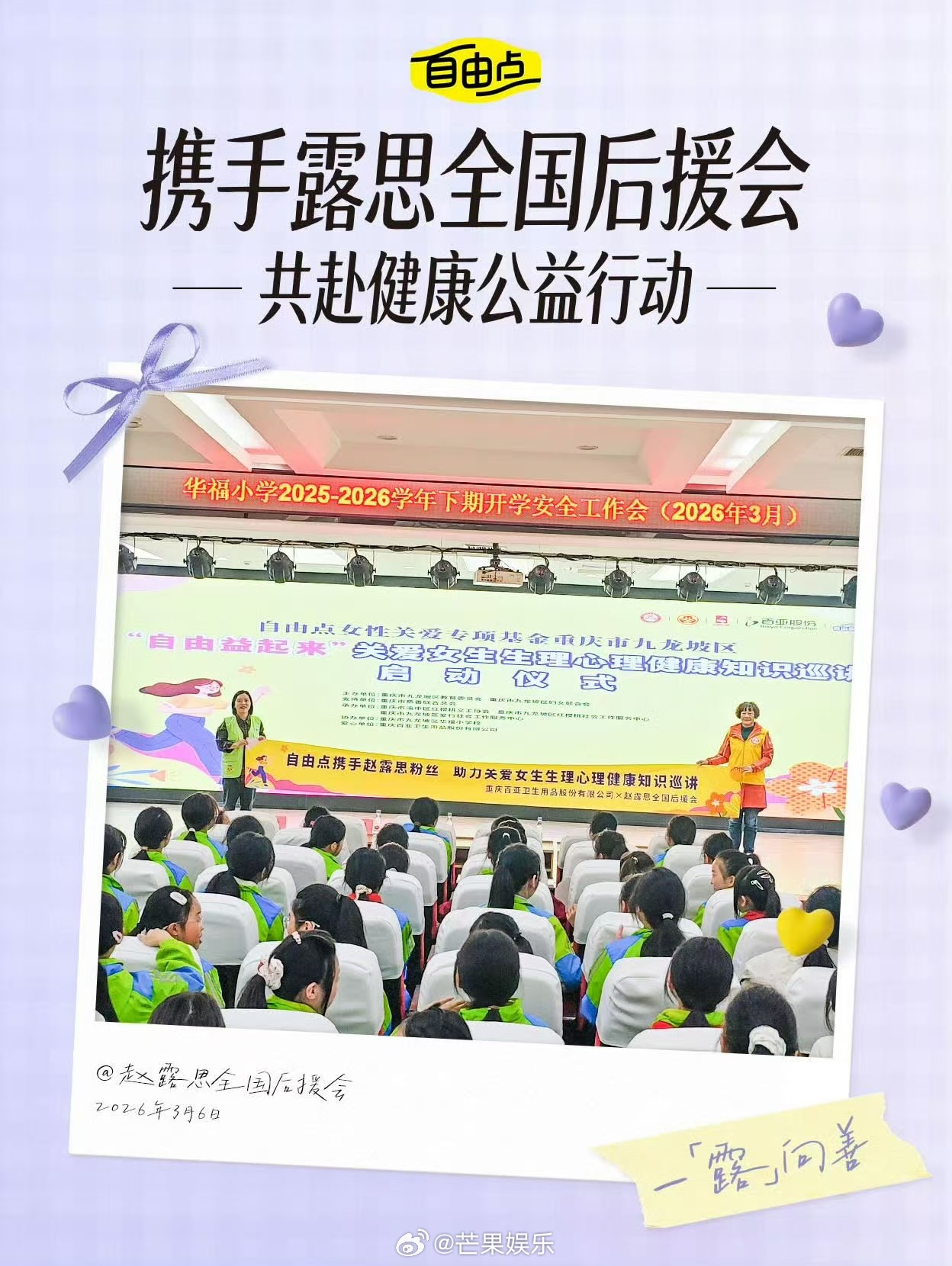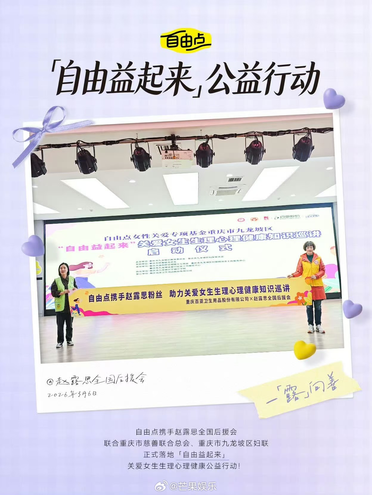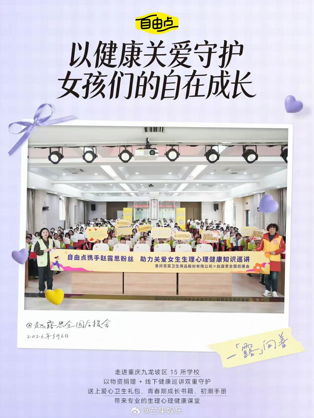 自由点不愧是国民级日用品!刚官宣露思为品牌全球代言人,紧接着就携手赵露思全国后援会一同投身公益,用实际行动关爱女生生理心理健康。把专业的生理期知识科普和暖心物资带进校园,有实力更有温度,这样有担当有格局的品牌怎能不圈粉!赵露思赵露思自由点全球品牌代言人自由点赵露思同款卫生巾什么样的人有什么样的粉丝公益女性帮助女性传递正能量