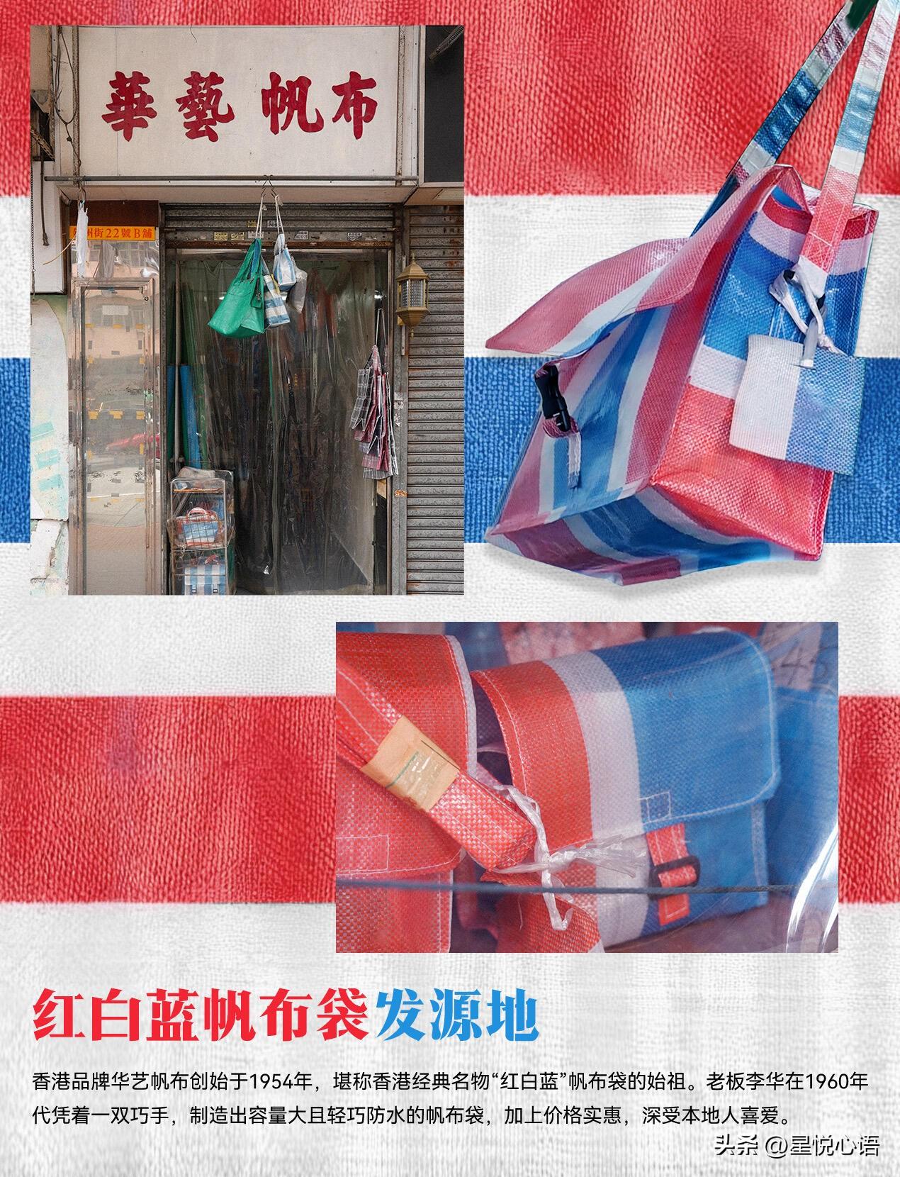 红白蓝袋,刻在香港人骨子里的记忆。 它从来都不只是个普通袋子, 更是属于香港的色彩图腾,藏着几代人的情怀。 这袋子的来头不小,早年是工地的防尘布, 后来香港华艺帆布的老板巧思改造, 做成了轻便防水又耐用的手提袋。 价格实惠还能装,搬家、购物、运货都能用, 成了香港人家里的万能袋,人手一个。 可以参考内地的“尿素袋”。 七八十年代,这袋子更是两地温情的载体。 港人回内地探亲,总用它装生活用品和舶来品,袋子沉甸甸的,装的不只是东西, 更是对亲人的惦念,是跨越山海的牵挂。 红白蓝袋耐磨坚韧的性子,恰是港人的模样。 坚毅不屈,还懂得灵活变通, 它见证了香港的岁月变迁, 陪着港人从漂泊到落地生根。 如今这抹红白蓝依旧鲜活,还有新的设计延续它的精神。 这小小的袋子,早已超越了实用本身, 成了香港本土精神的缩影, 一提及,全是满满的回忆与情怀。