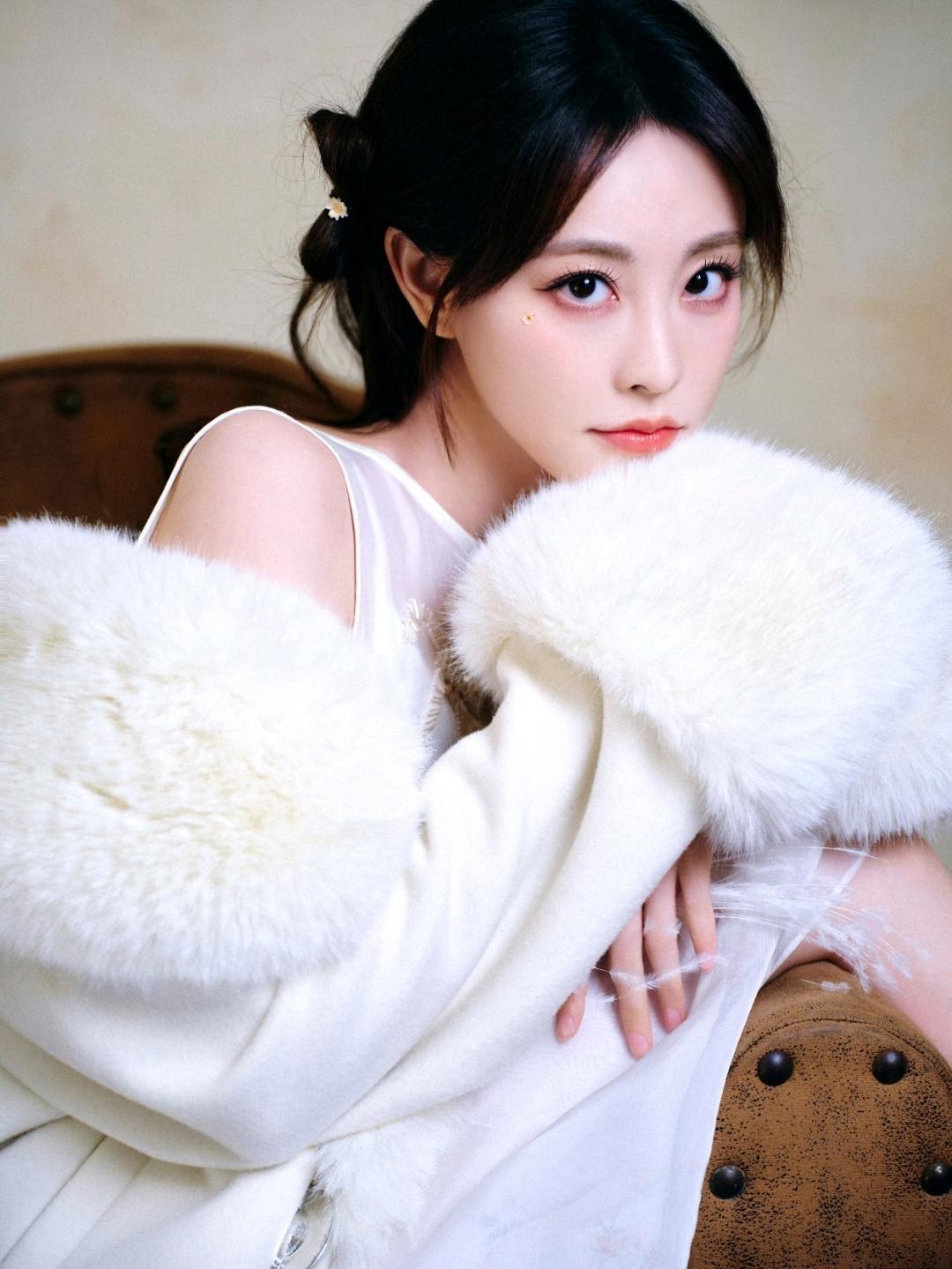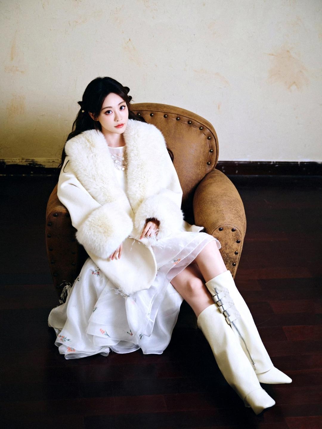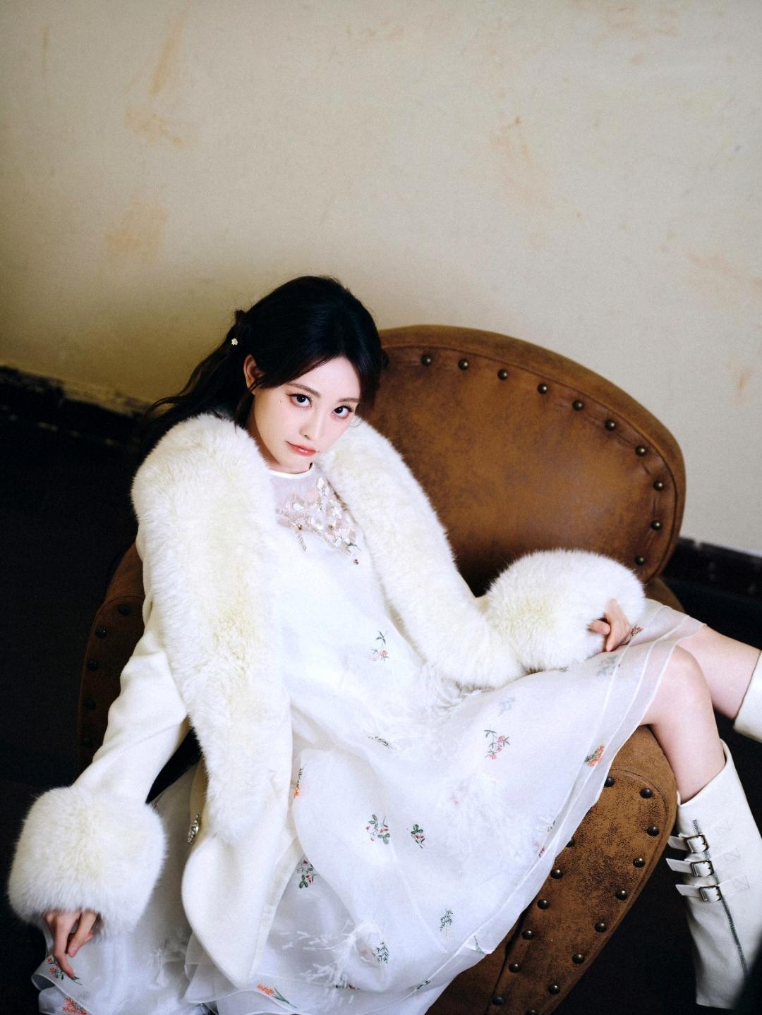 祝绪丹一袭纯白毛绒外套搭配轻纱刺绣裙,慵懒窝在复古棕椅中,整个人像极了冬日壁炉边融化的一团暖雪。清冷的眉眼与软糯的白色毛绒形成反差,眼角的金色细闪点缀出少女的灵动,完美诠释了什么叫**“人间富贵花”的顶级纯欲感**。