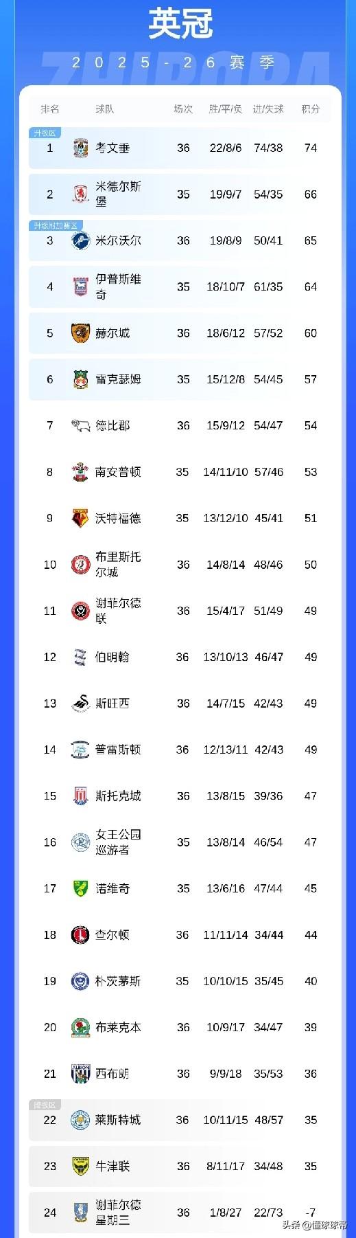 10年时间从天堂到地狱,前英超冠军莱斯特城在英冠陷入降级区! 在本轮英冠比赛中,莱斯特城1-1战平伊普斯维奇,在联赛中遭遇了10轮不胜,目前仅仅积35分处于降级区,距离保级还差1分,在联赛还剩10轮的情况下,莱斯特城保级形势相当不乐观。 十年前,莱斯特城在英超创造了“莱斯特城奇迹”,拿到了英超冠军震惊了全世界,没想到仅仅十年过去了,莱斯特城不仅从英超降级(这已经是夺冠后第二次降级),而且现在还沦落到在降级区挣扎,这要是降入英甲的话,那就真的万劫不复了。 值得一提的是,兰帕德执教的考文垂目前在英冠排名榜首,以9分优势领先升级附加赛区,可以说基本上确定要升到英超去了。当初兰帕德执教切尔西失败了,但是现在却带着英冠球队重新杀回了英超,证明了自己不是水货教练。