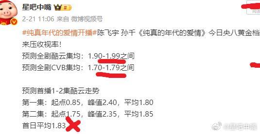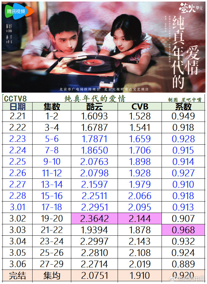 纯真年代的爱情 陈飞宇、孙千《纯真年代的爱情》央八收官战报全剧酷云集均:2.0751,暂列2/4全剧CVB集均:1.910,暂列1/4收视率很不错。开播之前预测低了好多