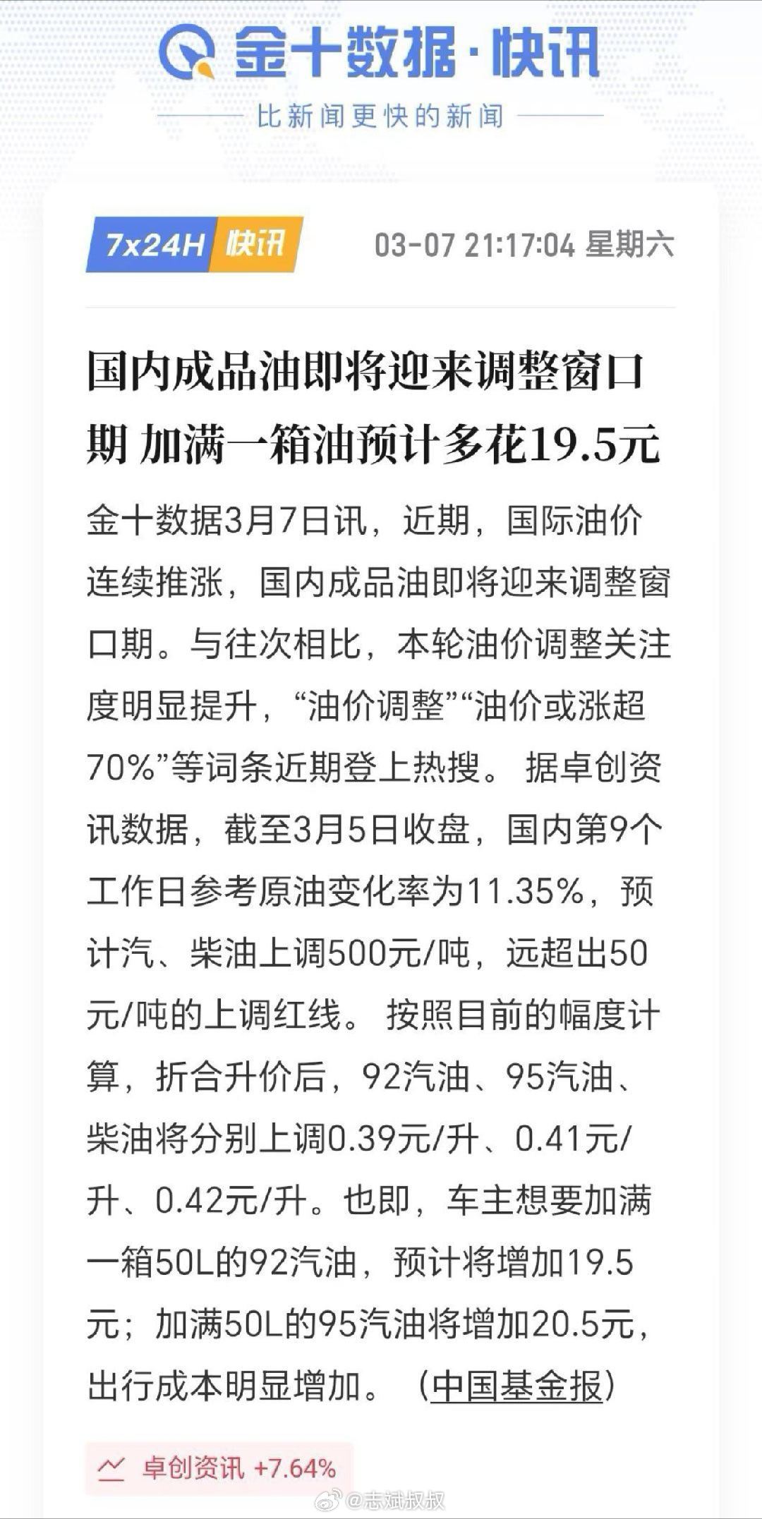 国内油价将于3月9日24时调整这次汽油每升至少上涨📈0.4元。