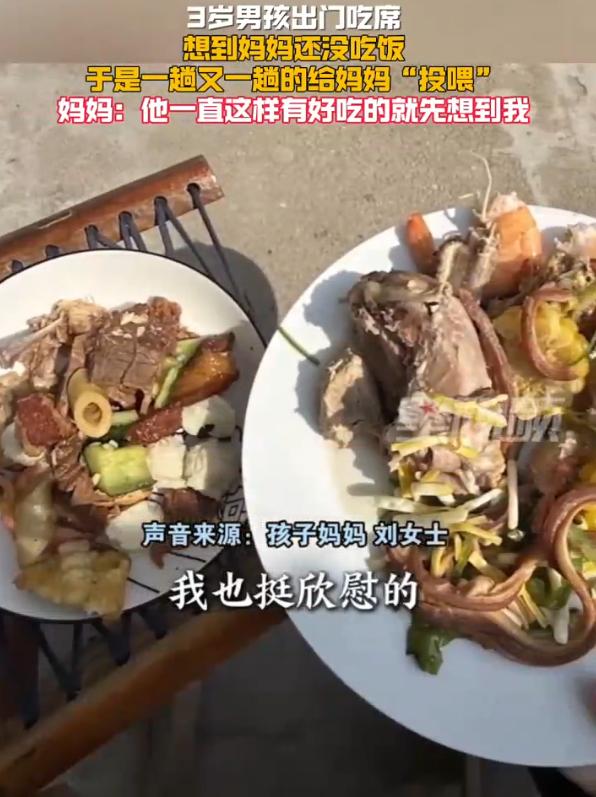 这孩子没白养!山东济宁,三岁孩子跟着姥姥姥爷出门吃席,期间想到自己的妈妈在家里还没吃饭,于是自己也不吃,一趟一趟的拿着食物回家“投喂”妈妈。网友:这又是别人家的孩子 从妈妈拍的视频来看,其实孩子每次拿回来的都不多,就用一次性的纸杯,一次拿回一点点,但孩子却乐此不疲,来来回回好几趟,硬是给妈妈拿回了一盘子的菜 妈妈刘女士表示,当时姥姥在席上给她剥了一个虾,他就说妈妈还没吃饭呢,拿回来后她就吃了,结果孩子看到妈妈吃了更开心了,就送来各种的菜,而孩子一直都是这样,有好吃的都想给父母 这事传到网上,评论区一边倒夸这孩子懂事。但人多了总会有不一样的声音,有人说这孩子没规矩,吃席哪有这么往家拿的,缺少礼数 我倒觉得,这话说得有点重了 三岁多的孩子,懂什么规矩不规矩?他脑子里就一件事儿:我妈妈饿着呢。这种本能,比什么礼数都珍贵 其实仔细想想,这孩子能这么做,肯定不是天生的。三岁的娃,能有这份惦记,说明平时在家里看到过,爸爸妈妈是怎么对老人的,怎么相互惦记的 孩子拿回来的东西,确实不多。一个纸杯装几块肉,一勺丸子汤,零零碎碎的。但他跑得欢实,每送一趟都特自豪。妈妈吃了,他比谁都高兴。这种快乐,是那种把最好的东西留给最重要的人,才有的快乐