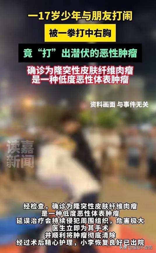 万万没想到! 广东东莞,一17岁男生在与朋友玩耍时,右胸被一拳打中,恰好打在他体内的小肿物上,男生以为忍一下就过去了,但被打中的肿物持续疼痛,并且疯长,父亲察觉不对,带男生去医院检查,才知道那个肿物是恶性肿瘤! 网友:太巧了! 这个17岁的少年叫小李,读高二。他右胸的那个小疙瘩,其实早就长在身上了。 像花生米那么大,不痛不痒,摸起来硬硬的,他一直以为是普通的脂肪粒或者青春痘,从来没放在心上。平时打球、跑步、跟朋友打闹,该干嘛干嘛,完全没影响。 出事那天就是课间跟朋友追着玩,朋友一拳挥过来,不偏不倚正好砸在这个小疙瘩上。当时疼得他龇牙咧嘴,缓了好一会儿才平复。 他没当回事,觉得就是普通磕碰,忍忍就过去了,甚至没敢跟家里说,怕被骂贪玩。 可这次的疼,跟以往任何一次磕碰都不一样。当天晚上,右胸那块就开始持续刺痛,根本睡不着。 第二天,疙瘩不仅没消,反而肉眼可见地变硬、变大,像被吹了气一样往外鼓,穿衣服摩擦到都疼得厉害。直到洗澡时,他对着镜子看到右胸那块不规则的突起,皮肤都被撑得发紧发亮,才彻底慌了神。 父亲看到儿子的样子,当场脸色就沉了下来,直觉这绝不是简单的淤青。当天就带着小李赶到了医院。 彩超一照,医生就发现情况不对,肿物内部已经出血,周围组织全是肿胀渗出。CT结果出来,情况更紧急,必须立刻手术。 术后病理报告让父子俩后背发凉——隆突性皮肤纤维肉瘤,一种低度恶性的体表肿瘤。 这种病最可怕的地方,就是早期太会伪装。它不痛不痒,生长缓慢,跟普通的硬疙瘩没区别,绝大多数人发现时,都已经长了很久。 很多人看到新闻会说,这一拳把肿瘤打出来了,太邪门。其实根本不是这么回事。肿瘤早就潜伏在他体内,那一拳只是个导火索。 外力撞击导致肿瘤包膜破裂,内部血管出血,引发了剧烈的炎症反应,这才把原本安静的肿瘤“激活”了,让它开始疯长、疼痛,最终暴露了真面目。 这事儿听着离奇,背后藏着的却是青少年健康的大隐患。现在的孩子,学业压力大,作息不规律,平时有点小疼小痛,总觉得年轻扛得住,根本不会往心里去。 身上长个小疙瘩、小硬块,只要不疼,就觉得是小事,谁会专门跑医院去查? 更让人揪心的是,这类体表肿瘤在青少年身上并不少见,因为早期没有任何症状,隐蔽性极强。等到出现疼痛、变大、破溃这些信号时,往往已经错过了最佳干预时机。 小李算是幸运的,那一拳虽然疼,却意外帮他揪出了体内的定时炸弹,手术切除后恢复得很好。 可并不是每个人都有这样的“运气”。临床中太多案例,都是身上的小疙瘩长了好几年,等到疼了、变大了才去看,一查就是恶性。 青少年的身体处在快速发育阶段,免疫系统的波动、生活习惯的影响,都可能让这些不起眼的小疙瘩发生恶变。 别总觉得癌症是中老年人的事,现在肿瘤年轻化的趋势越来越明显。尤其是这种体表的隆突性皮肤纤维肉瘤,好发于躯干、四肢,早期就是个无痛的硬结节,极易被当成普通疙瘩忽视。一旦延误治疗,它会持续侵犯周围组织,处理起来会麻烦得多。 各位家长真的要多留心,平时多留意孩子身上的异常。不管是哪个部位,只要出现不明原因的硬块、结节,哪怕不痛不痒,也别不当回事。 尤其是短期内变大、触碰疼痛、形状不规则的,一定要及时去医院做个超声检查,花不了多少钱,却能买个安心。 年轻不是挥霍健康的资本,身体发出的任何信号,都值得我们重视。别等意外发生,才追悔莫及。 各位读者你们怎么看?欢迎在评论区讨论。
