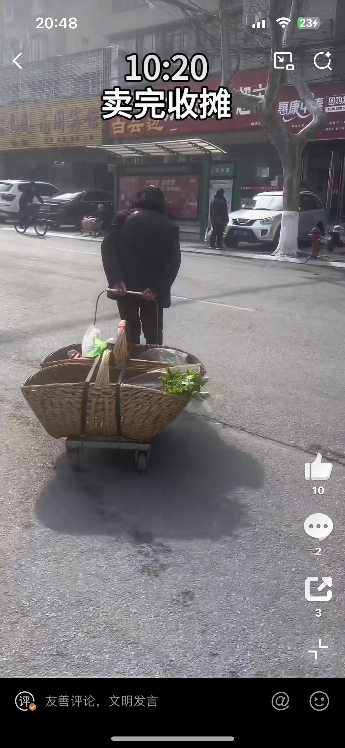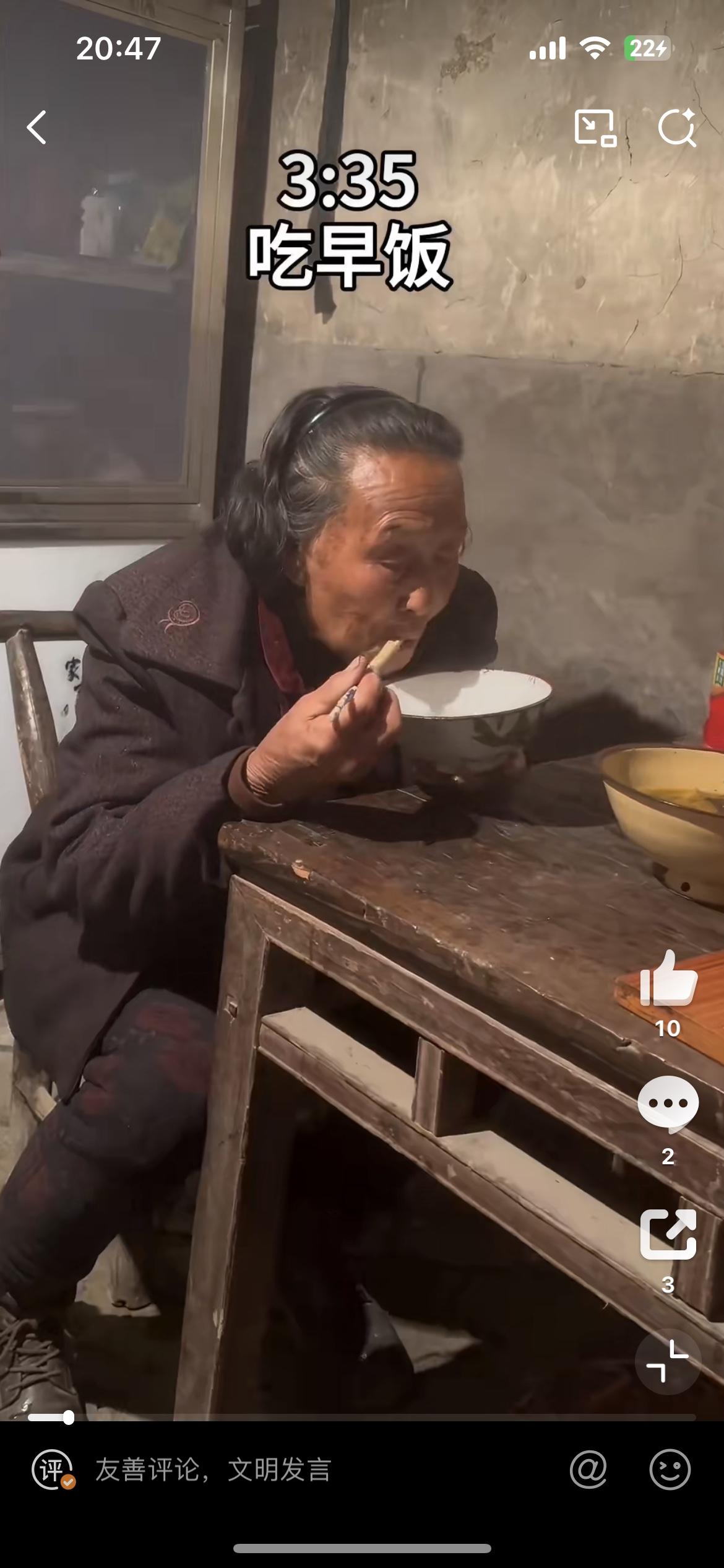 湖北一位90后独居老人,一天的真实生活。 凌晨3点,生物钟自然醒,洗漱、做早饭,去田里摘菜。 收拾好菜,赶头班公交车,坐一个小时到县城摆摊。 5点多到地方,一直卖到中午12点,菜卖完才收工回家。 下午1点到家,做饭吃饭,洗漱,晒被子,再准备第二天要卖的菜。 晚上做完饭,吃完洗漱,9点半准时睡觉。 日复一日,年复一年,周而复始。 虽然已是90多岁高龄,身体依然硬朗。 自己种菜、自己卖菜,挣点零花钱,够自己日常开销。 这就是很多农村老人的真实写照: 只要还能动,就一直干下去。 没有享福,只有不停劳作,看着真的太让人心酸了。