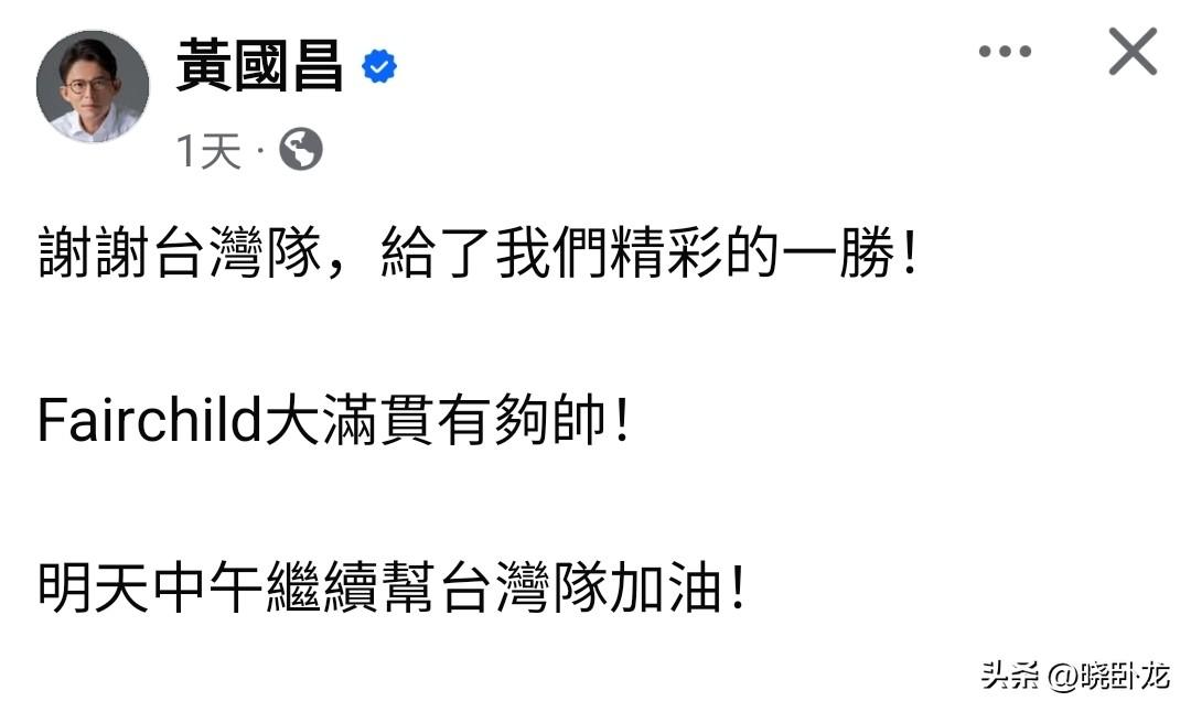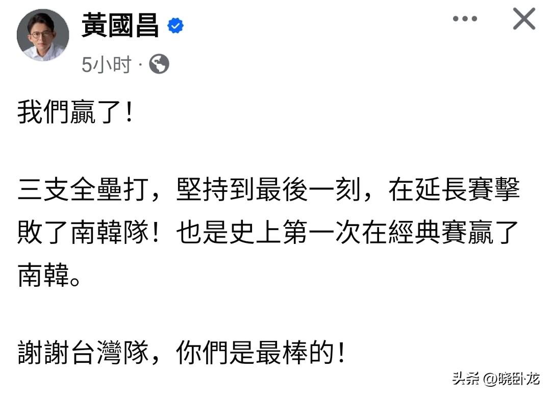 从这个小细节就可以看出台湾民众党主席黄国昌是“深绿”。 中国台北棒球队最近先输给日本棒球队,然后今天(3月8号)又赢了韩国队,今天岛内蓝绿白政客纷纷发文祝贺,我发现其中有一个细节值得注意,蓝营的蒋万安、王鸿薇、侯友宜等人都说是“中华队”,而绿营的几乎所有人全是称呼“台湾队”,令人感到意外的是民众党主席黄国昌也称“台湾队”,也就是说黄国昌和绿营那帮人一样,即使有很多民众党支持者(小草)一直提醒要说“中华队”,黄国昌还是坚持用“台湾队”称呼,而且多次强调,所以从这个小细节可以看出黄国昌骨子里就是“深绿”,虽然他和民进党不和,但是立场方面几乎可以确定是一致的,都是“独”。 最后,希望绿营政客们和黄国昌能够及时纠正自己的错误,应该使用中国台北队这个队名,包括蓝营这边也是一样,大大方方的喊出“中国台北队”。