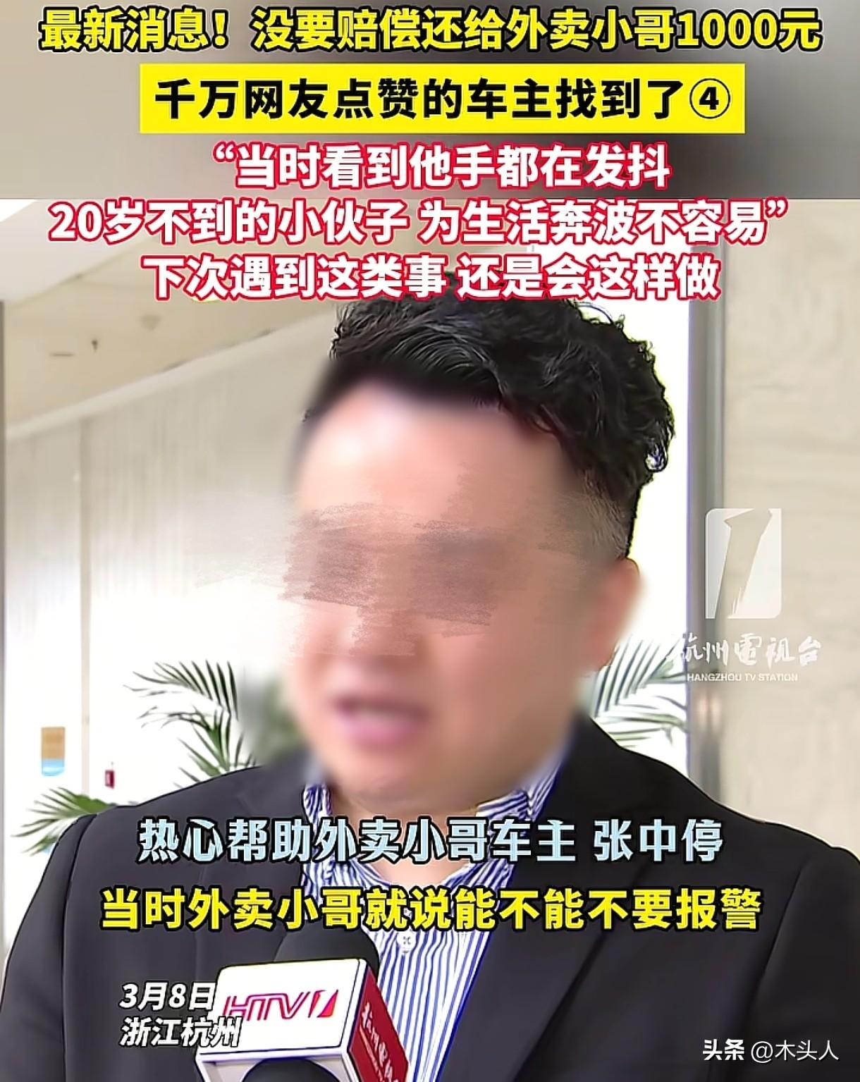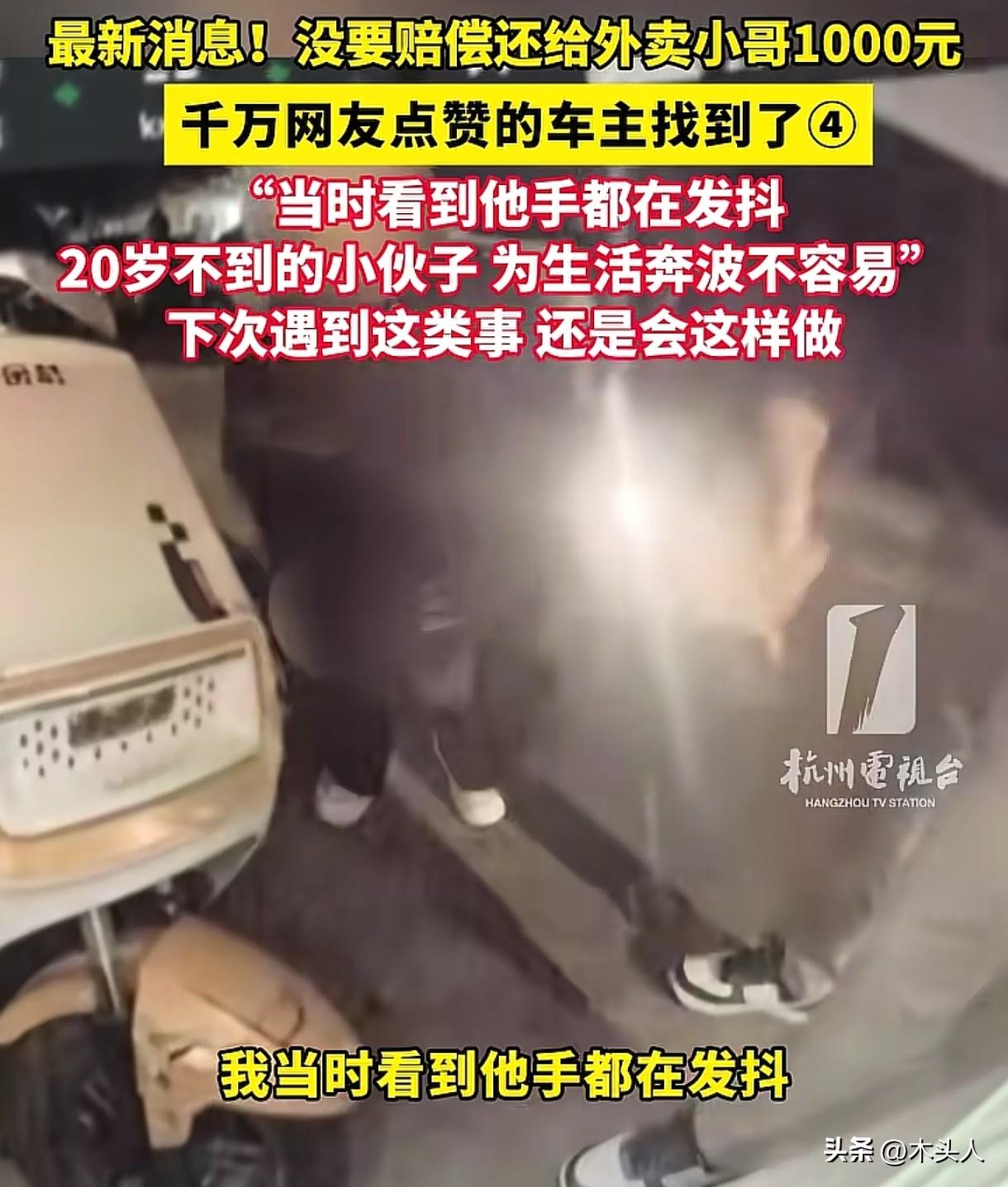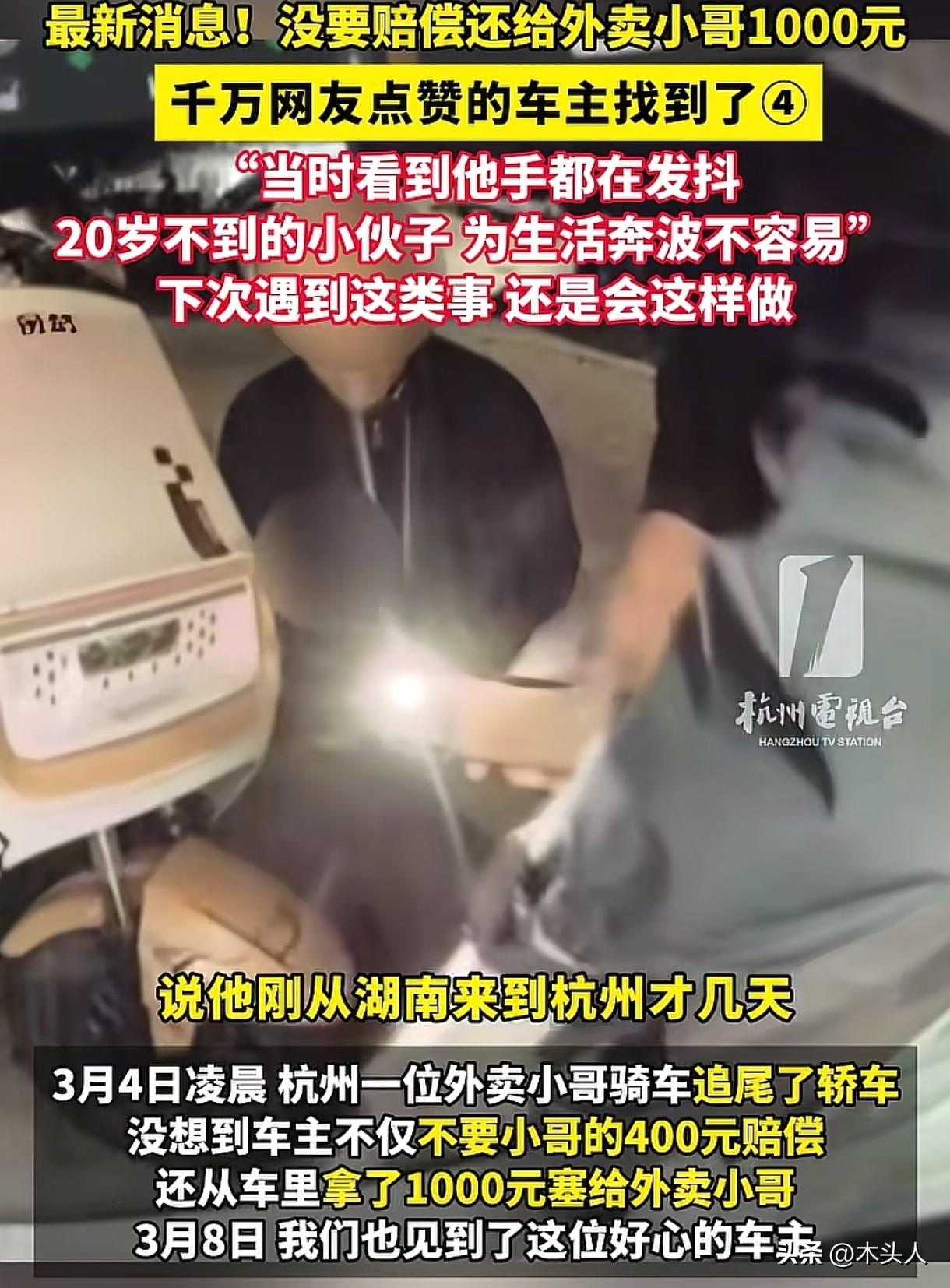 “浙江又上大分了!”杭州,男子在路边正常停车,突然听到“砰”的一声,一外卖小哥骑着电动车,撞到了男子的车尾。男子下车后问小哥有没有事,小哥说自己只是摔破了皮,无大碍。男子看到自己车位雷达被撞坏了,准备报警定损,可没想到,外卖小哥却请求他能不能不要报警,说自己才来上班没几天,没赚到钱,能不能先赔400元?男子一时心软,转身上了车,做了一个谁也没想到的举动。 3月4日凌晨1点多,街道上冷冷清清的,只有路灯散发着昏黄的光,给这寂静的夜添了几分暖意。 张先生是一名90后创业者,忙了一整天生意,他拖着疲惫的身体开车回家。 他把车缓缓停在路边,刚停好,就听到“砰”的一声巨响。 张先生心里“咯噔”一下,赶紧下车查看,只见一辆电动车重重地撞在了他的车尾上,一名外卖小哥摔倒在地。 他急忙上前查看外卖小哥的伤势,得知小哥只是擦破一点皮,身体无大碍后,他悬着的心也放松了下来。 他看到外卖小哥的电动车前轮和挡风板都撞裂了,外卖撒了一地。 再一看自己的车,车尾雷达被撞坏了,这维修起来估计得花几千块钱,张先生刚想打电话报警。 外卖小哥却一脸惶恐,眼神中满是无助。 他跟张先生说,自己刚从湖南来杭州没几天,还没赚到啥钱,恳求张先生不要报警,自己先赔400给张先生。 张先生看着眼前窘迫的小哥,又看了看他被摔破的衣服和发抖的手,心里一阵发酸。 小哥看起来年纪并不大,脸上稚气未脱,可能20岁不到,这样的年纪,还在元宵节晚上凌晨一两点为了生活而奔波,他叹了口气,转身回了车上,拿出来一个红包。 他不仅没有让小哥赔偿,还拿了一个1000元的红包给小哥,小哥不要,他就硬塞到了外卖小哥手里。 事后张先生说:“如果是我弟弟,在外遇到难处,我也希望有人拉他一把,下次碰到这样的事情,我还会这么做。” 张先生把此事发在网上后,说人怎么可以善良成这样,瞬间引发了网友们的讨论。 有人替外卖小哥谢谢张先生:你给了他一束光,照亮了他以后的路,谢谢你,好心人。 苦难从来不值得歌颂,值得歌颂的是那份积极向上的努力,外卖小哥深夜还在送外卖,为了生活奔波,张先生是基于这一点帮助的对方。 也有人说:杭州是一座温暖的城市,看到这个视频,我居然落泪了。 对于外卖小哥来说,撞到他人车辆,发生追尾事故,可能需要承担一定的赔偿费用,但是这对于刚来上班,还没赚到钱的他来说,是一个沉重的负担。 《民法典》第1213条规定:机动车发生交通事故造成损害,属于该机动车一方责任的,先由承保交强险的保险人在责任限额内赔偿;不足部分,由承保商业三者险的保险公司按合同赔偿;仍不足或未投保商业险的,由侵权人赔偿。 外卖小哥在送餐途中发生追尾事故,张先生是正常停车,那么小哥可能需要承担事故责任。 如果他有保险,那保险公司可以来赔这笔钱。 如果他还没买好保险,这几千块钱可能就需要他自己或者站点来出,无论是哪种结果,可能都会影响到他的工作。 张先生得知对方的难处后,并没有要求小哥赔偿,反而给了小哥1000元的红包,他的做法真的很暖心。 出门在外,谁都有遇到困难的时候,外卖小哥初来乍到,生活不易,张先生设身处地为对方着想,给予帮助,让人感动。 张先生的这份善意就像一道光,温暖了外卖小哥的心,也让这座城市多了一份温暖。 对于此事,大家怎么看?