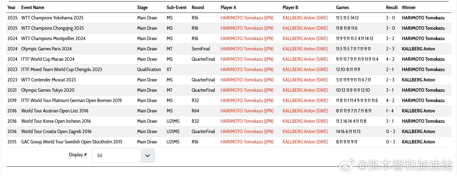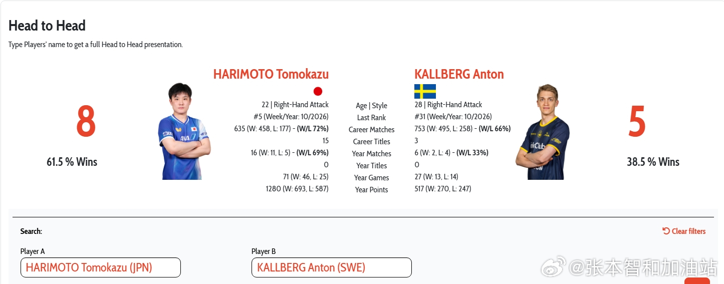头对头记录 张本智和 8-5 卡尔伯格:25横滨冠军赛 3-0 (5,5,12);25重庆冠军赛 3-0 (8,8,6);24蒙彼利埃冠军赛 3-2 (9,-9,2,-4,12)24巴奥团体赛 2-3 (5.5.-7.-7.-9)24世界杯 4-2 (-9,7,-9,9,9,4)前略。