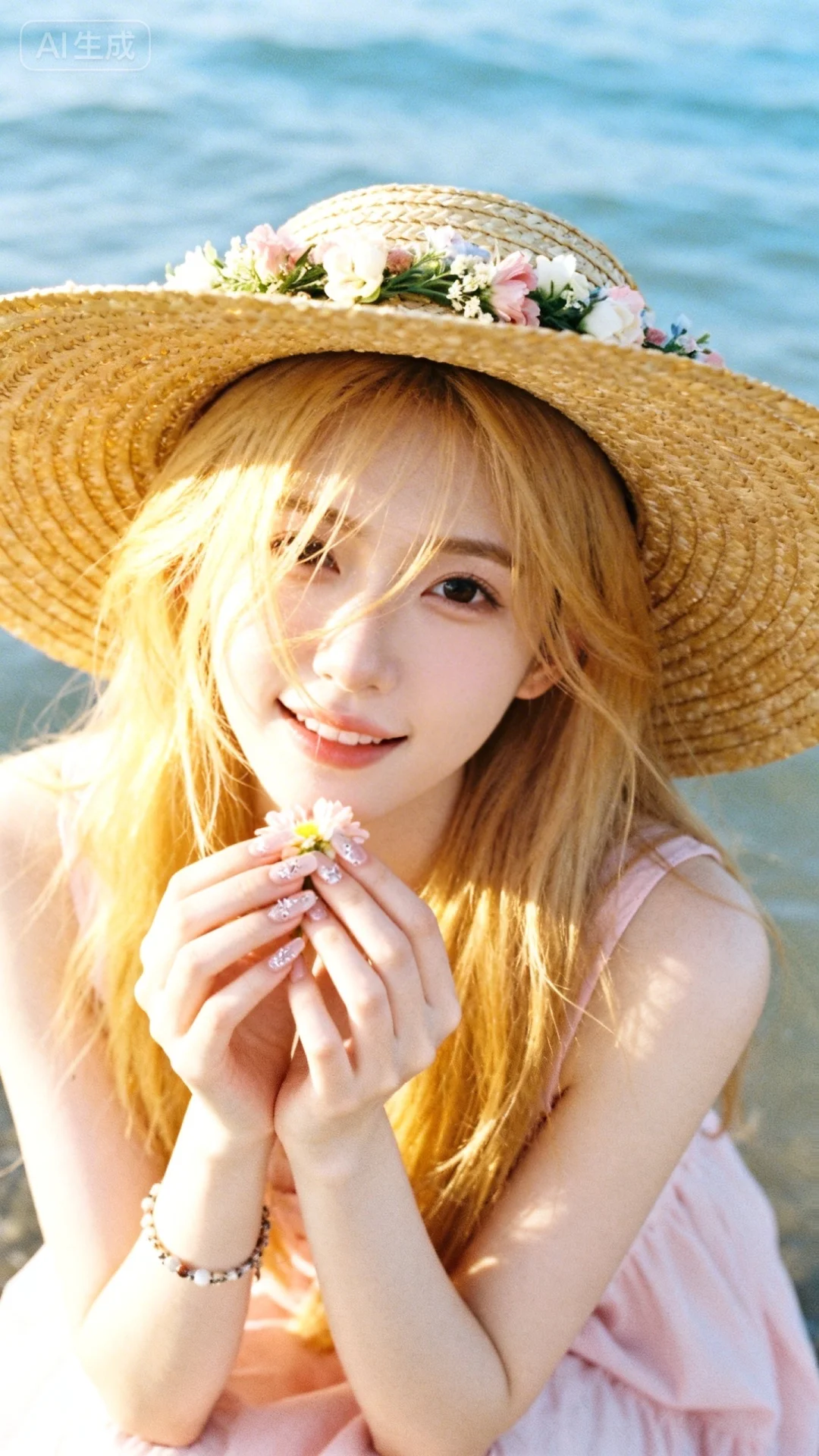 将图片处理为手机拍摄风格,超低分辨率,近距离面部特写,应用暖调日系滤镜。画面中是超级白、超级瘦、超级漂亮的冷白皮女子,留黄金色长发,些许发丝遮挡眼前,穿浅粉色无袖连衣裙,戴超大檐草编帽(边缘带花圈),做精致美甲,手上戴手链,双手捧着花朵,表情调皮可爱,黄金色长发自然散落,发丝发光,稍微俯拍视角,海面改为浅蓝色,比例3:4。比例 9:16。比例 9:16。