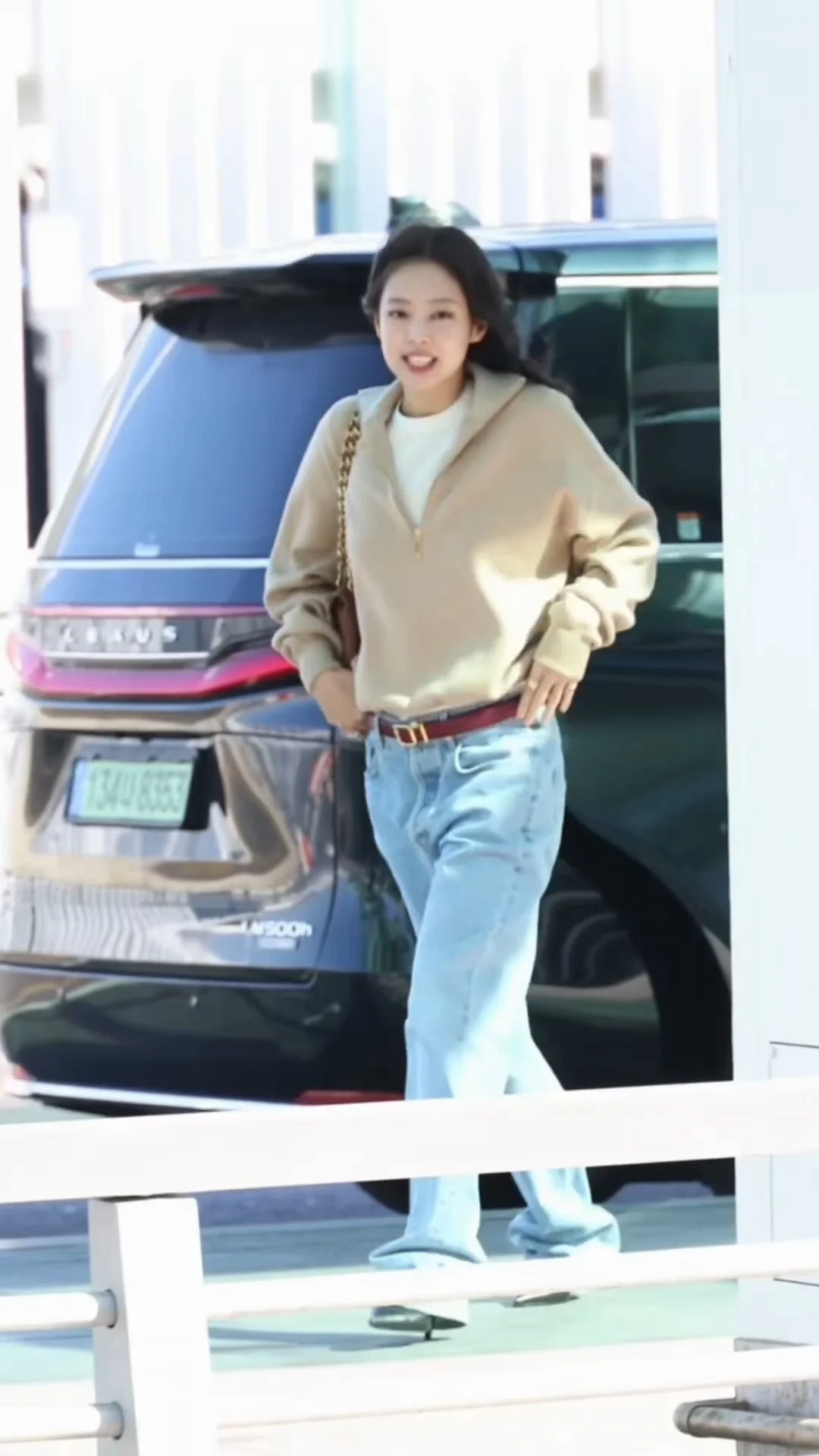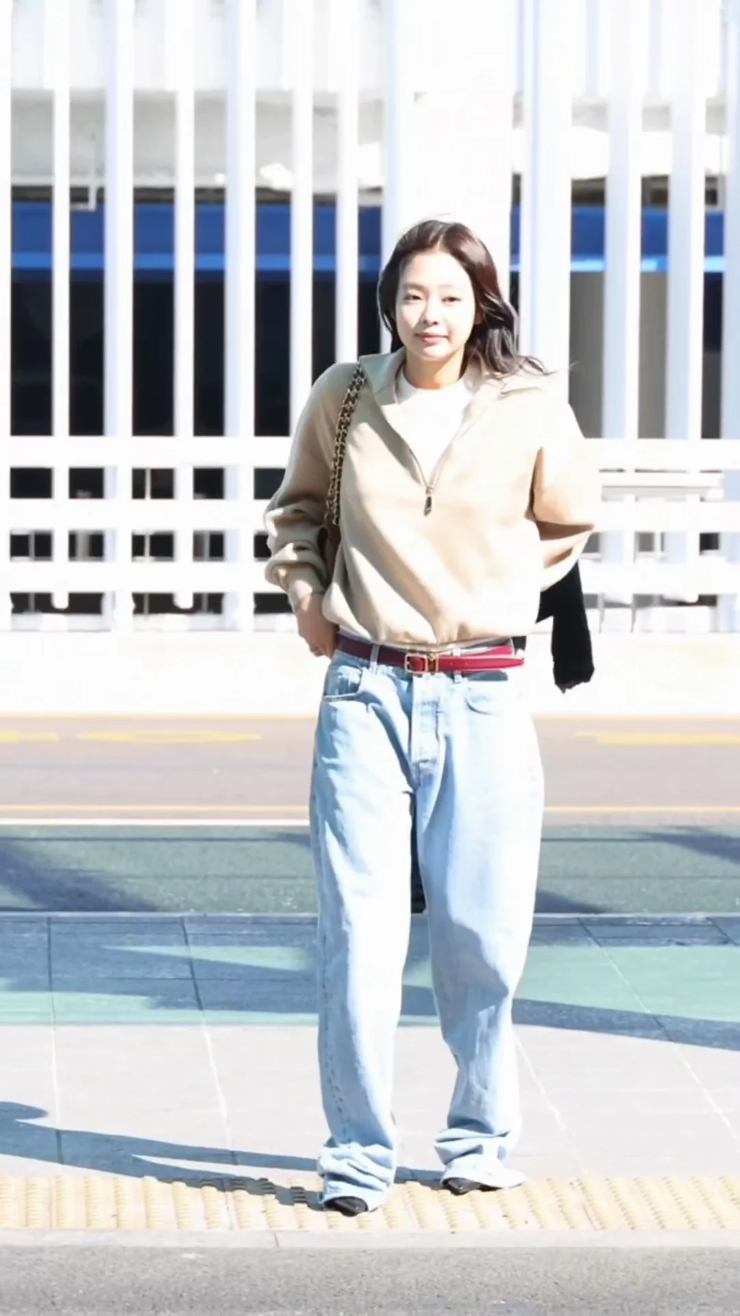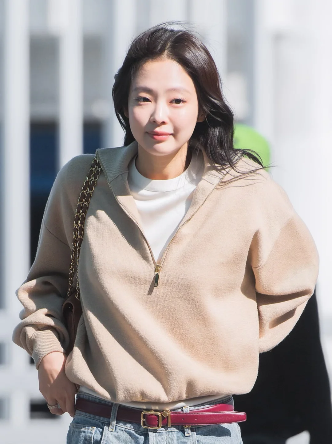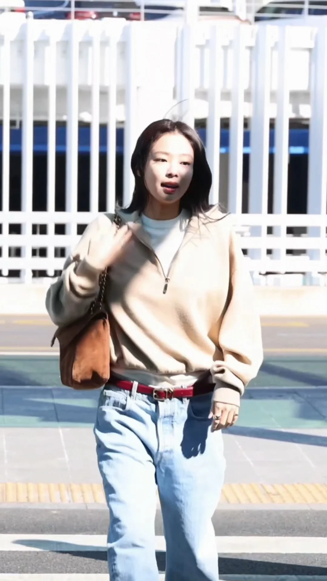 Jennie今日机场街拍穿搭,针织衫搭配牛仔裤和尖头高跟鞋,妮味满满!