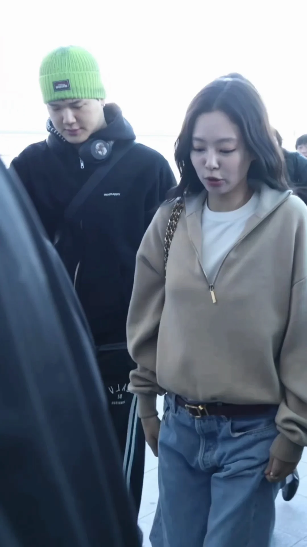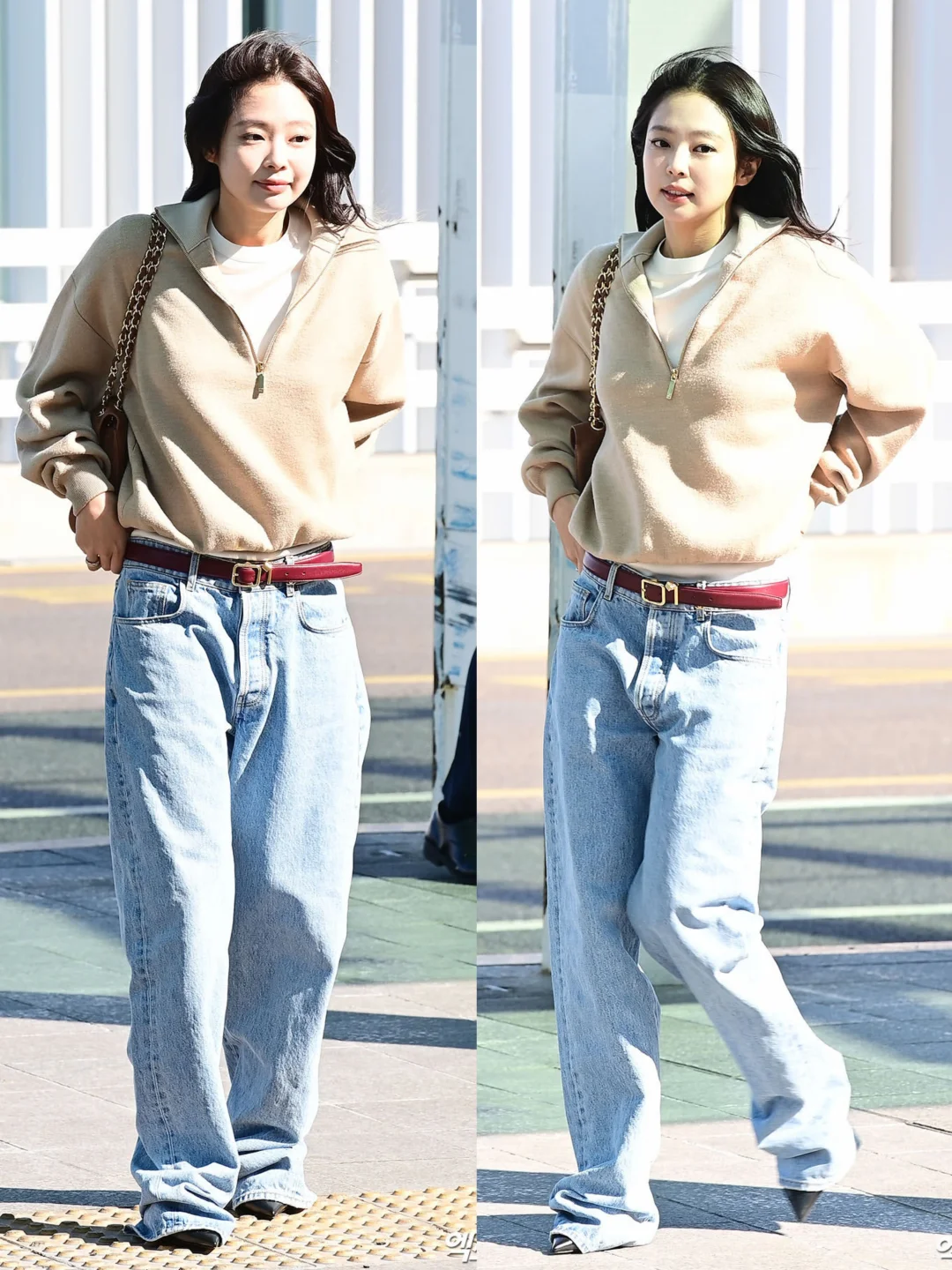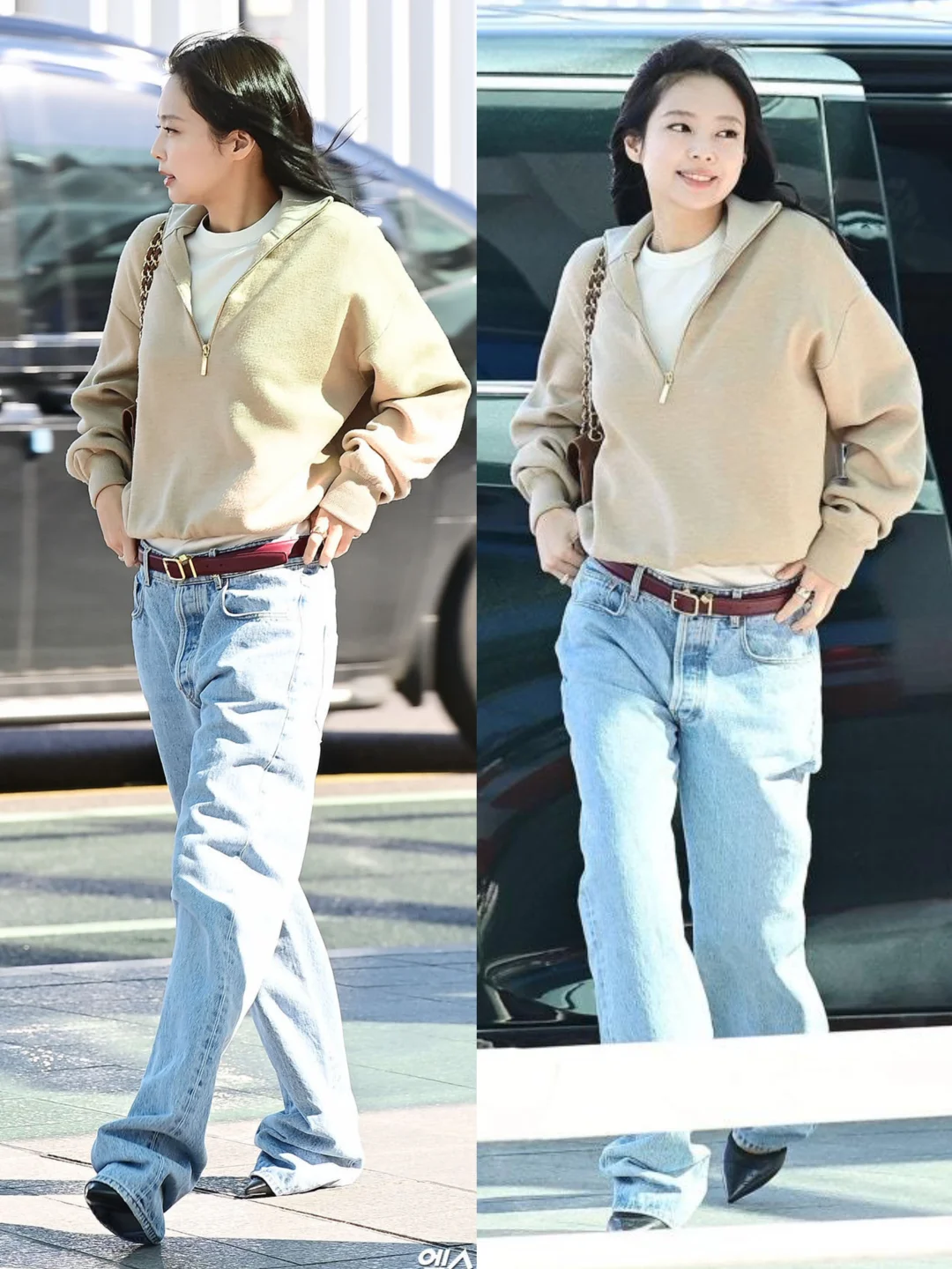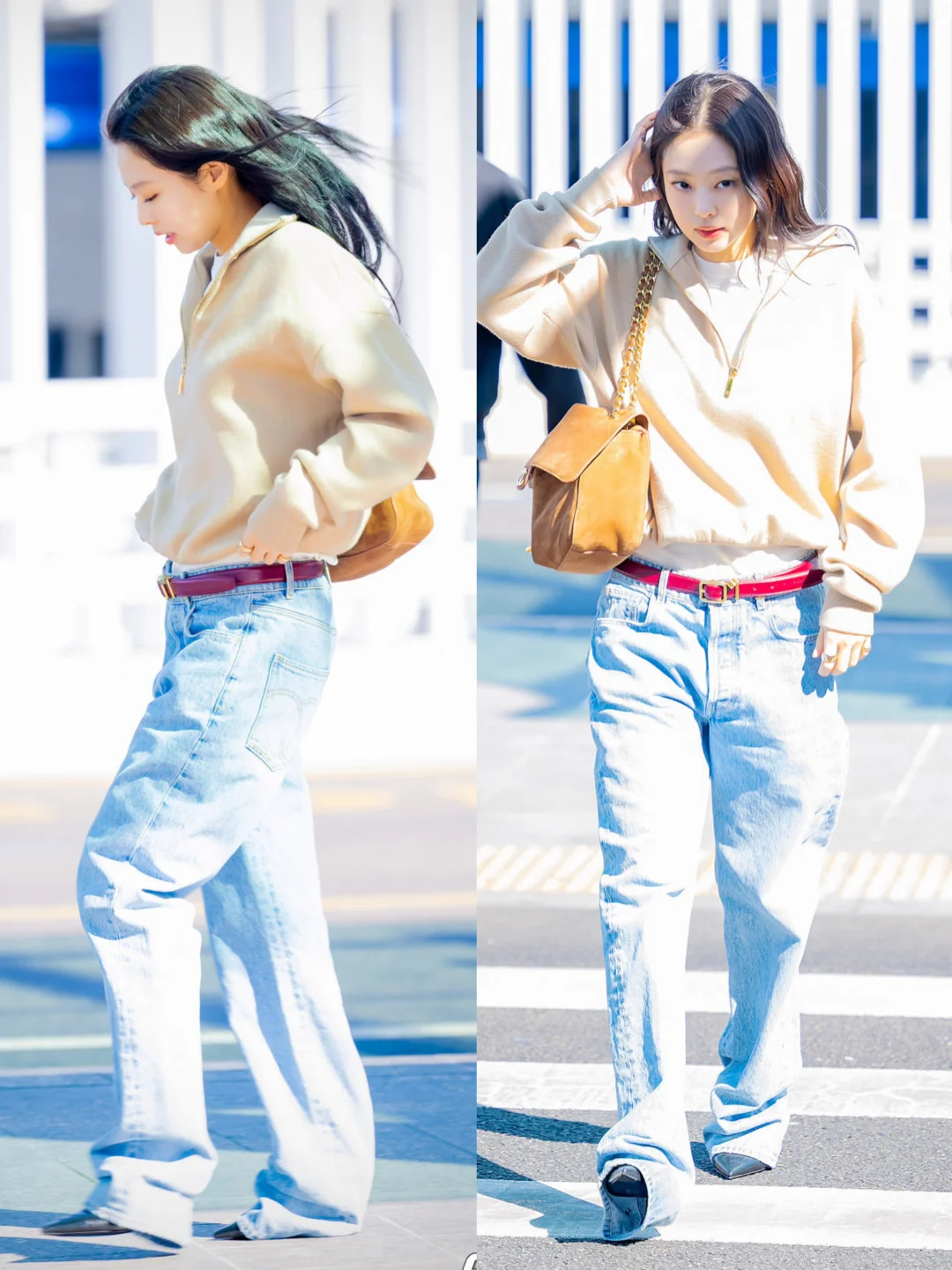 Jennie今日机场街拍穿搭,针织衫搭配牛仔裤和尖头高跟鞋,妮味满满!