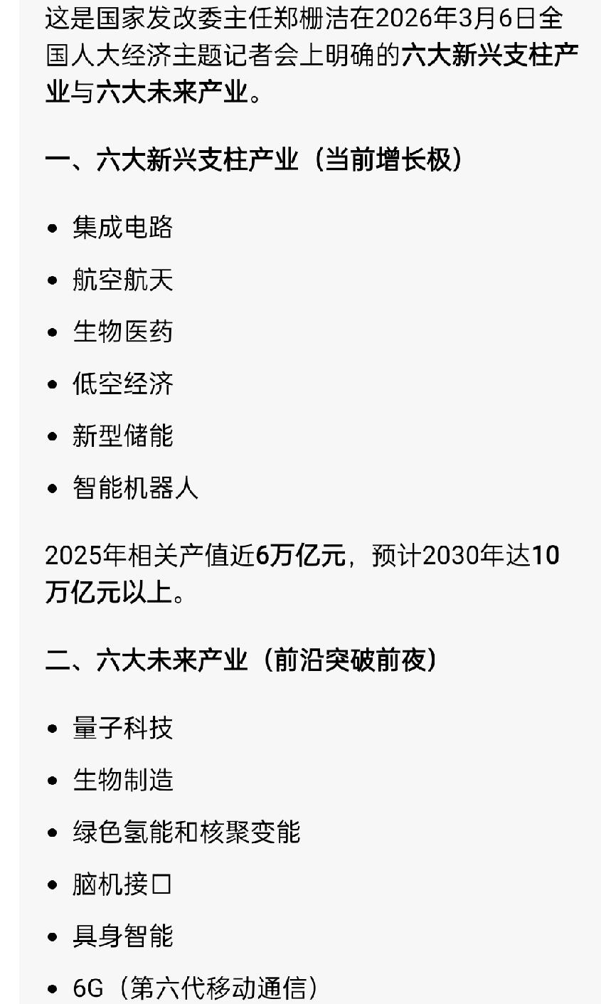 未来发展方向已经明牌了。六大新兴产业 : 集成电路,航空航天。生物医药。低空经济,新型储能,智能机器人。 六大未来产业 : 量子科技。生物制造,绿色氢能和核聚变能,脑机接口。具身智能。6G(第六代移动通信) 六大新兴支柱产业方面,集成电路不就是半导体吗?航空航天和商业航天紧密相关,生物医药不就是以创新药为主吗?低空经济周五才涨过啊,永赢低碳环保都涨了快4%了,新型储能不就是固态电池为主吗?智能机器人不就是人形机器人嘛。 六大未来产业方面,量子科技不太了解,生物制造也比较新颖,绿色氢能和核聚变能不就是氢能源和可控核聚变嘛,脑机接口有点抽象啊,具身智能很前卫啊,6G不就是新一代的通信嘛,也包含CPO。