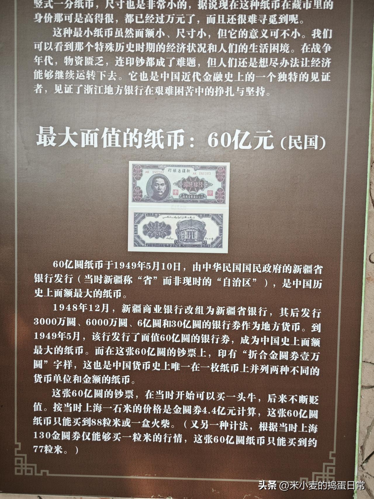 60亿一张的纸币,却买不到一斤米 这才是最扎心的“巨款” 你敢信吗?中国历史上居然有过一张面值60亿的纸币!但更扎心的是,这张“天文数字”的钞票,在当时连一斤米都买不到,只能换几十粒米或者一盒火柴。 这张60亿元的纸币,是1949年5月由新疆省银行发行的。当时的通货膨胀已经到了离谱的程度,物价飞涨,货币贬值速度比印钞机还快。这张纸币上甚至还印着“折合金圆券壹万圆”,成了货币史上唯一一张同时列两种单位和金额的钞票。 一开始它还能换一头牛,到后来,按上海的行情,这60亿也就够买88粒米。这哪里是钱,分明是那个动荡年代里,老百姓手里攥不住的绝望。 现在我们手机支付几秒钟就完成,很难想象当年人们扛着一麻袋钱去买米的日子。这张60亿的纸币,就是那段历史最沉重的注脚。 你还知道哪些关于旧中国通货膨胀的冷知识?评论区聊聊。