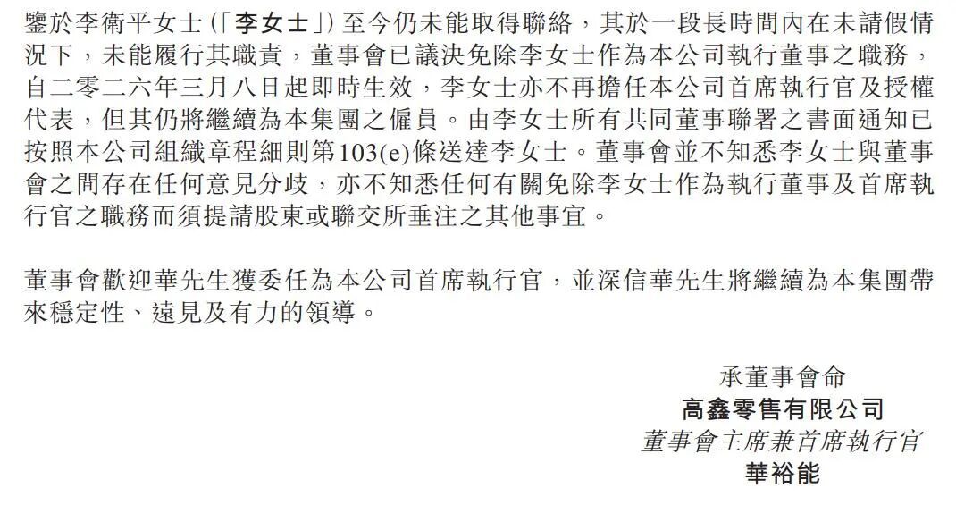 #大润发母公司CEO失联被免职#3月8日,大润发母公司高鑫零售(06808)公告称,鉴于李卫平女士至今仍未能取得联络,其于一段长时间内在未请假情况下,未能履行其职责,董事会已议决免除李女士作为本公司执行董事之职务,自3月8日起即时生效。董事会主席华裕能已获委任为本公司首席执行官、由非执行董事调任为执行董事,并获委任为本公司之授权代表,自3月8日起生效。公告称,李女士不再担任本公司首席执行官及授权代表,但其仍将继续为本集团之雇员。网页链接