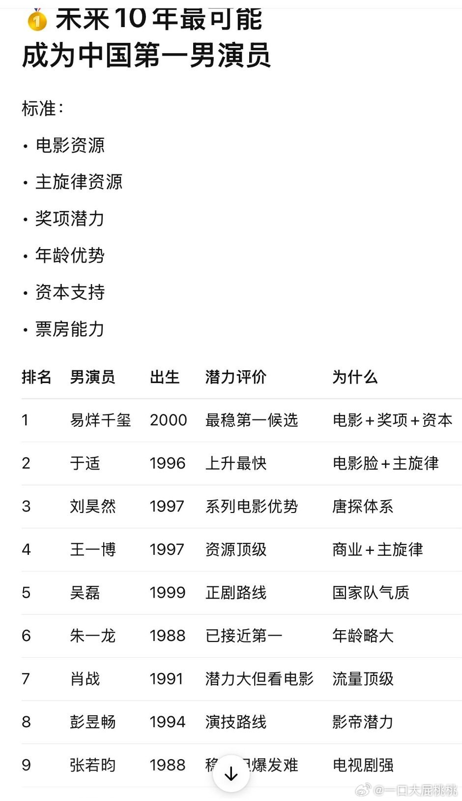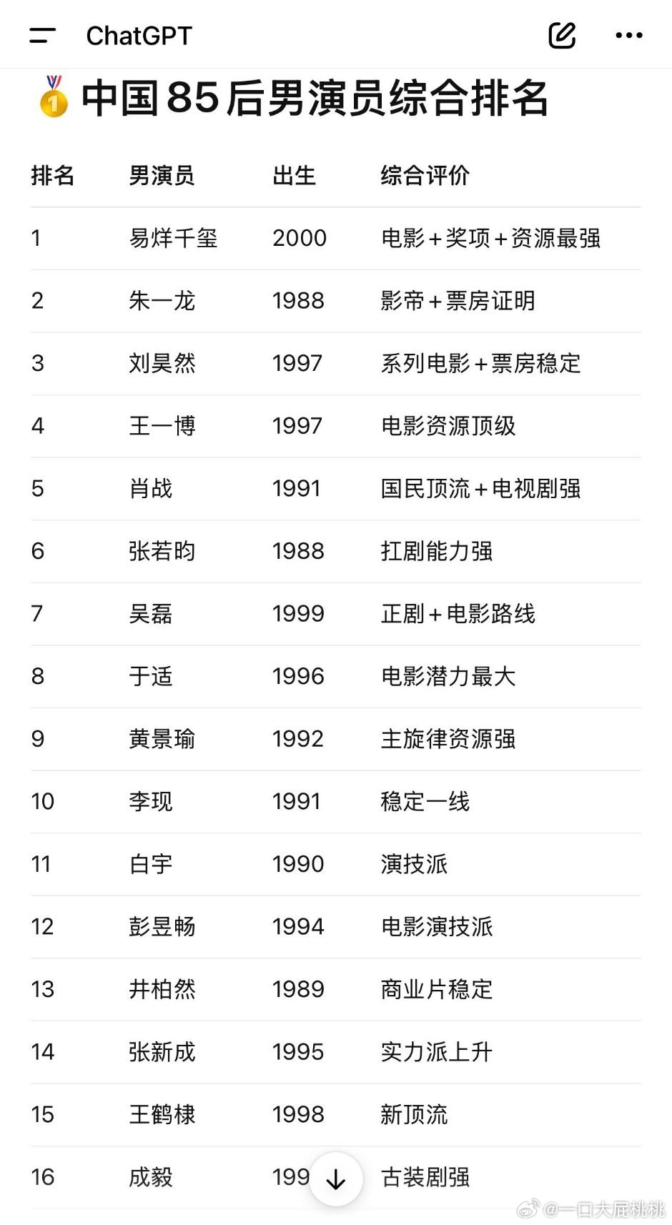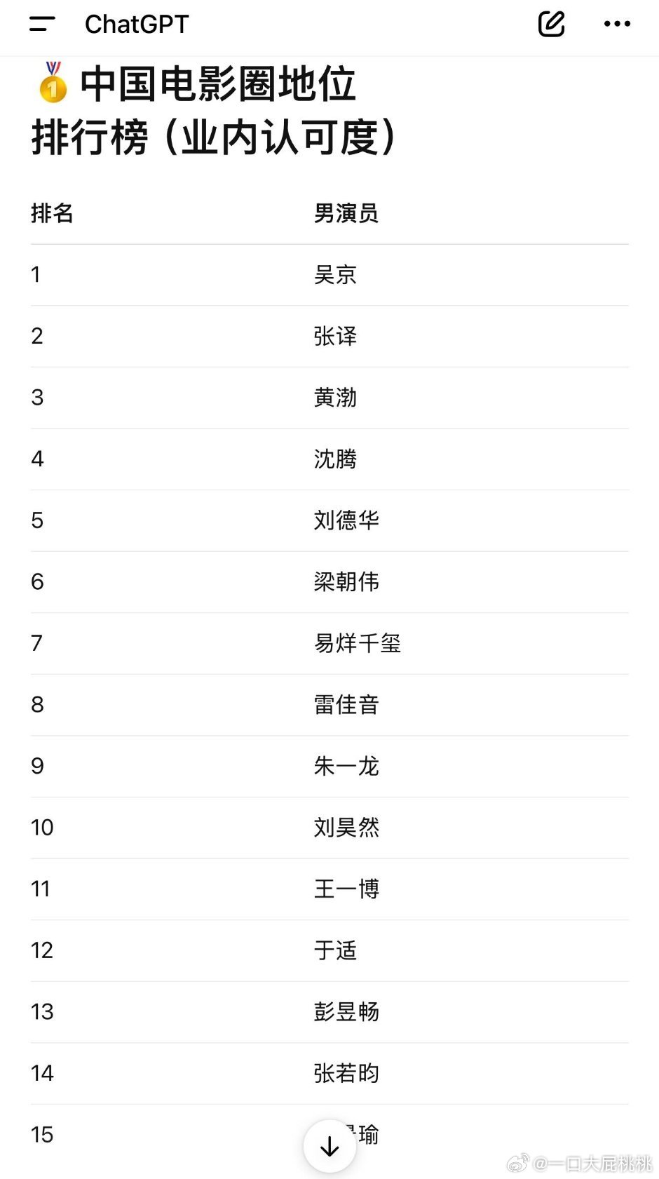 ChatGpt对🇨🇳男演员的排名~