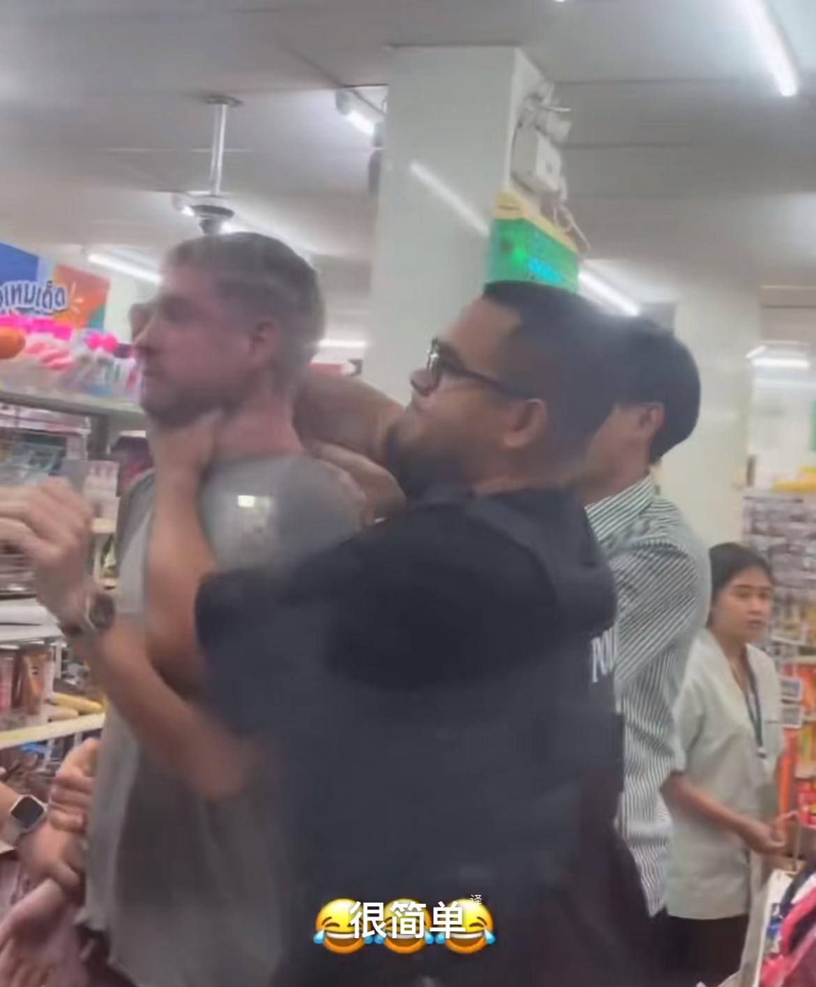 泰国7-11,英国游客袭击泰国警察,把他扑倒在地上,拼命挥拳,便利店员工全都上来阻止,但是英国男子丝毫没有停止袭击。场面一片混乱,最后在店员的协助下,警察反手把男子拿下了
