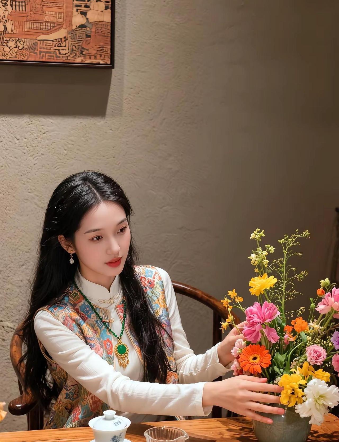 女子,黑色长发,身穿白色长袖内搭、彩色提花马甲,佩戴绿色项链、金色吊坠;在室内(木质桌面,摆放茶具、透明公道杯),摆弄色彩丰富的花束(含粉色、黄色、橙色花朵),背景有中式挂画,整体风格雅致文艺,充满中式生活美学的氛围感。