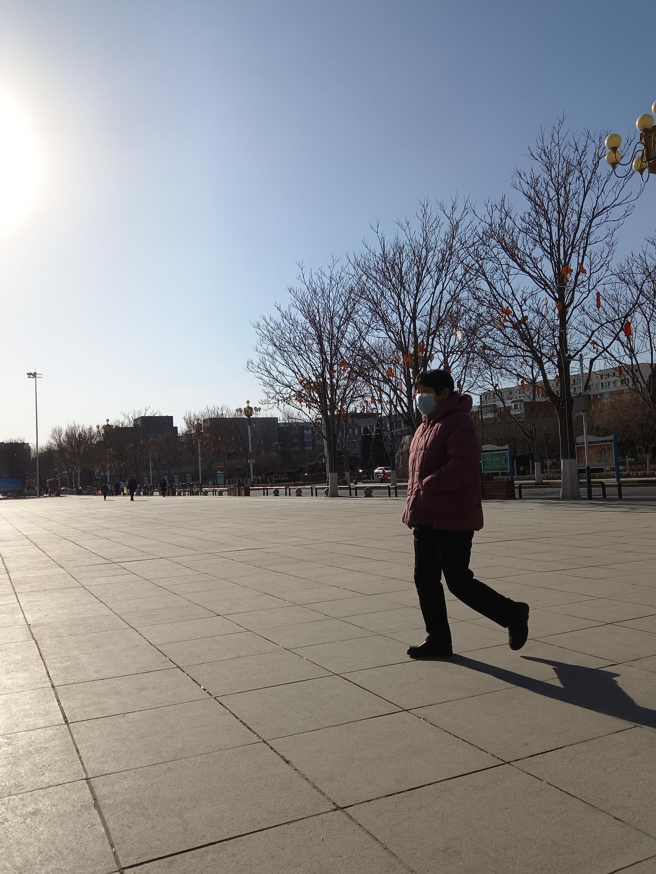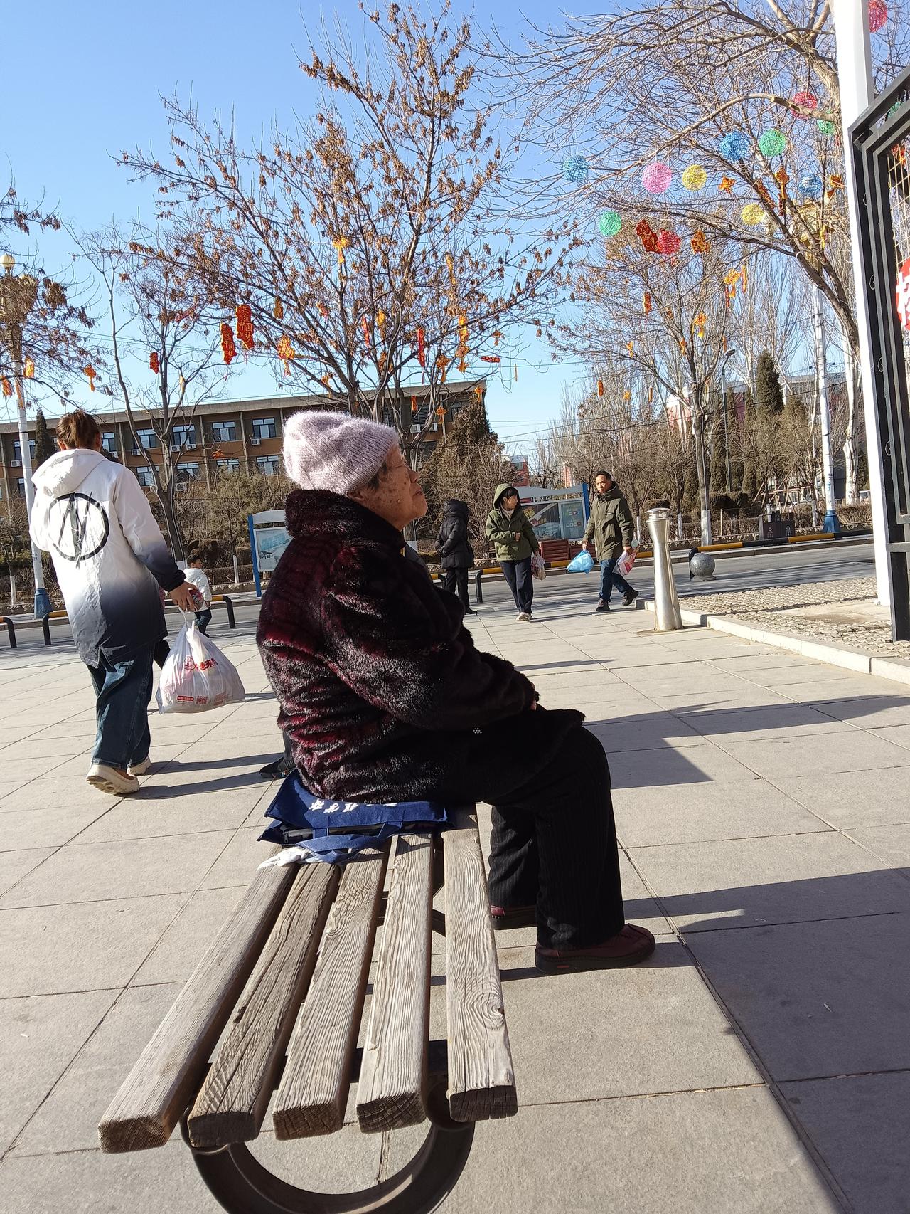 冬日暖阳下,慈祥奶奶坐在长椅上,享受宁静时光。