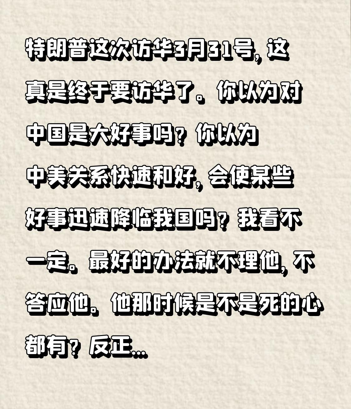 特朗普定于3月31号访华,这终于要来了。你觉得这对中国是大好事吗?你以为中美关系迅速缓和,某些好事就会立刻降临我国吗? 我看未必。 最好的办法就是不理会他,不答应他的要求。到那时,他怕是想死的心都有了。 反正到这个时候,我们也经历过各种打压了。他还能怎样? 不过我觉得最后我们还是会给他个面子,和他谈一谈。