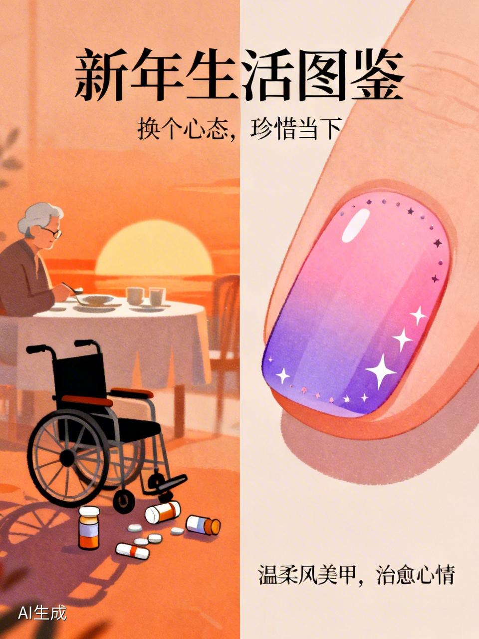 新年生活,有百态滋味。有的人到晚年,明明生活优渥,儿女孝顺,养老金丰厚,却总觉得不如意。就像那位近九十岁的老人,身体虽有些小毛病,但生活能自理,老伴也能照顾她,可她却整天抱怨婚姻不幸、命不好,把日子过得凄苦。其实,换个心态,珍惜当下,生活也可以很美好。 当然,生活也有小确幸。像超爱的温柔风美甲,简单耐看,能治愈心情。新的一年,愿我们调整好心态,既能坦然面对生活的不如意,也能发现身边的小美好,把日子过得温暖闪亮。