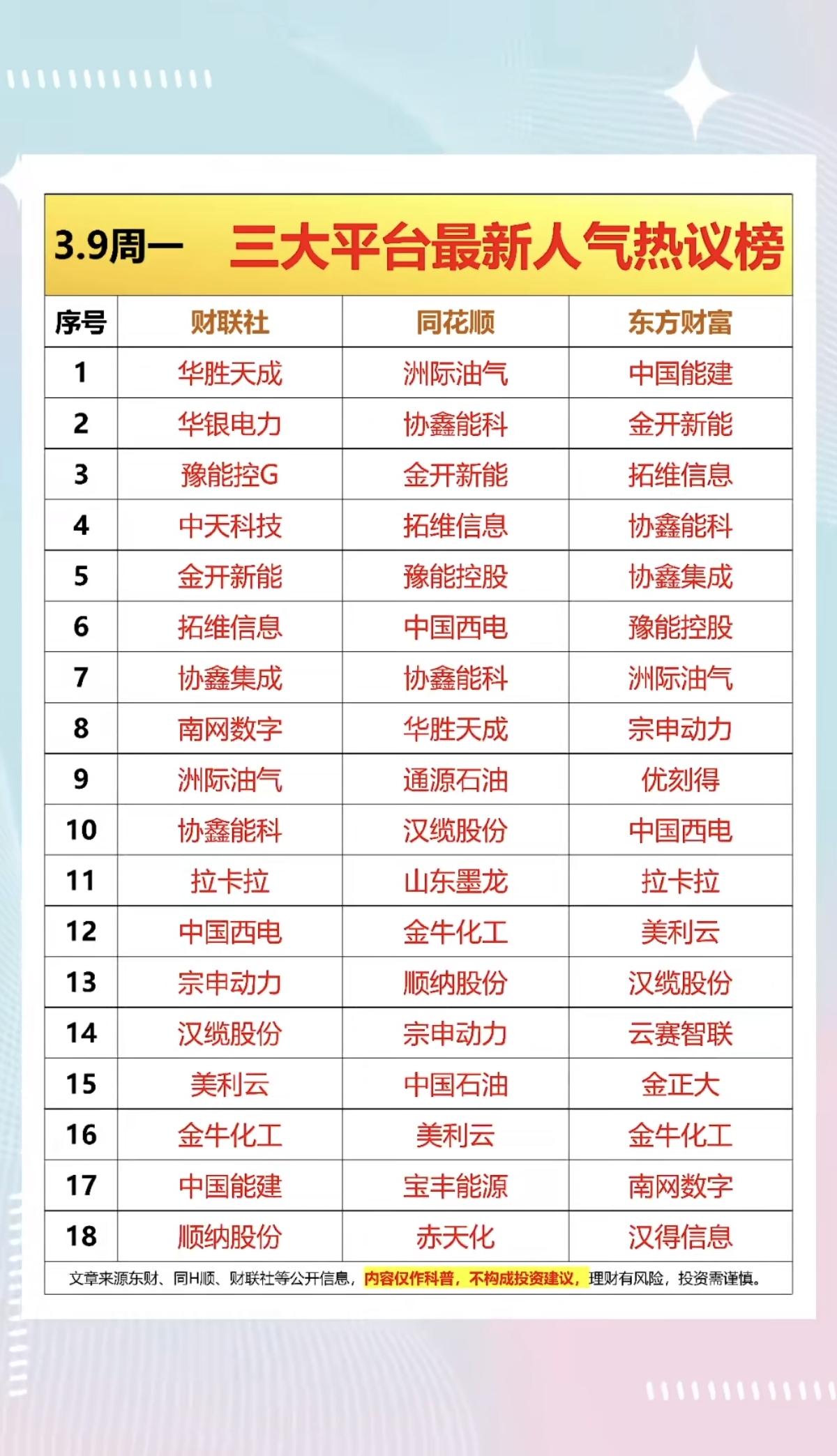3.9周一 市场热点方向+人气热搜榜! 1.华为昇腾,AI芯片替代 2.算电协同 3.OpenClaw龙虾智能体 4.未来能源 5.人工智能 6.无人机 7.油气、海运、化工甲醇、尿素、化肥 相关核心龙头股: