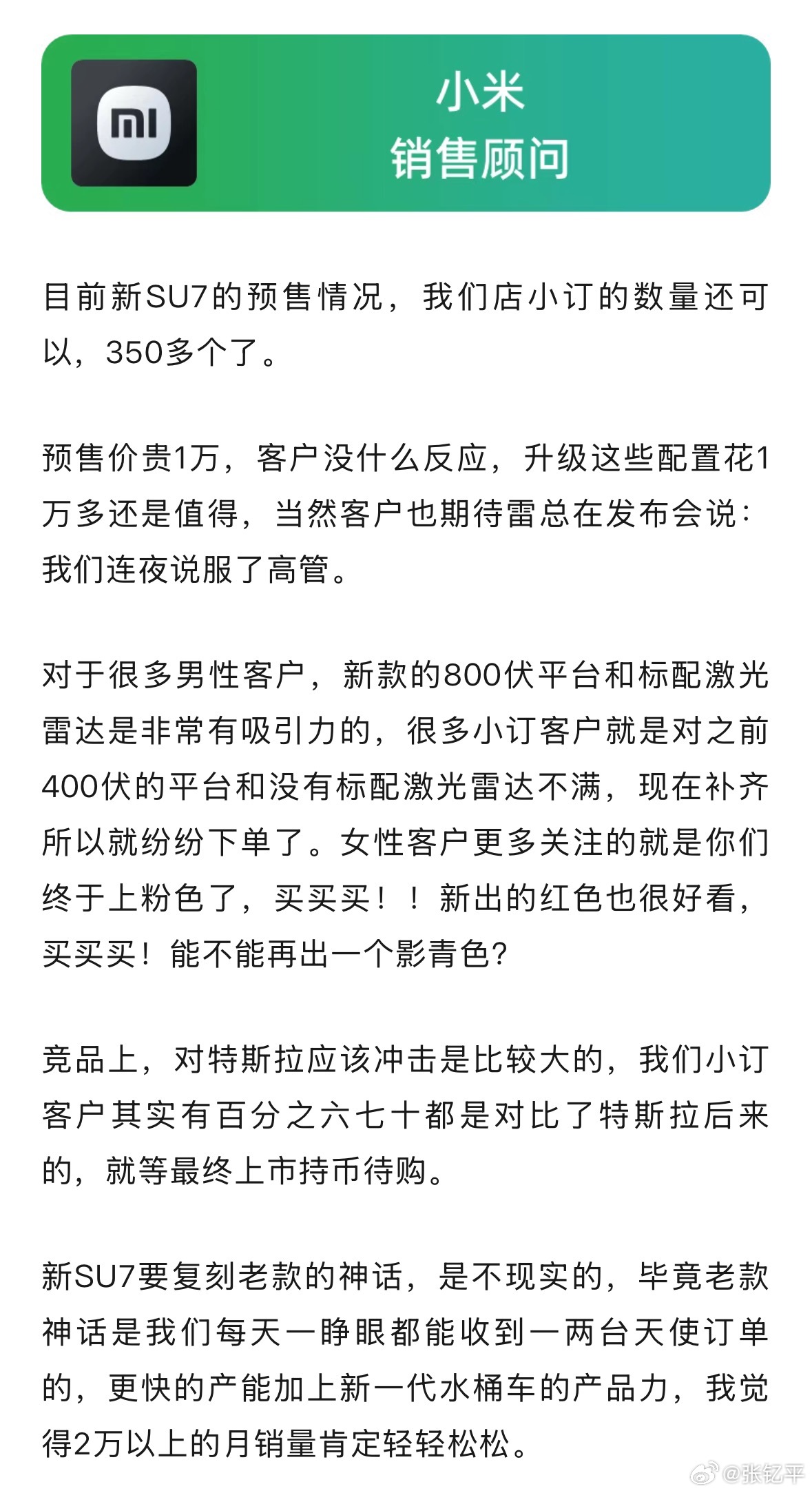 小米销售1:本店小订的数量350多个,要复刻老款的神话是不现实的,毕竟老款是我们每天一睁眼都能收到一两台天使订单的。竞品主要还是特斯拉,我们小订客户有60-70%对比过特斯拉。