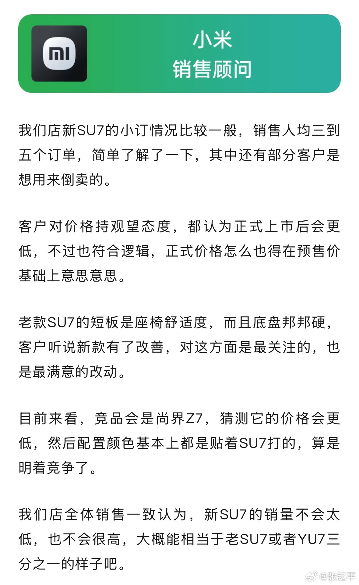 小米销售2:我们店新SU7的小订情况比较一般,销售人均三到五个订单。全体销售一致认为,新SU7的销量不会太低,也不会很高。目前来看,竞品会是尚界Z7,猜测它的价格会更低。
