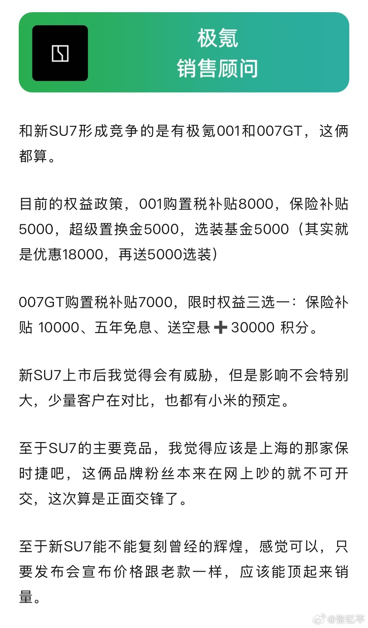 极氪:SU7的主要竞品应该是上海的那家保时捷,这俩品牌粉丝本来在网上吵的就不可开交。至于新SU7能不能复刻曾经的辉煌,感觉可以,只要发布会宣布价格跟老款一样。