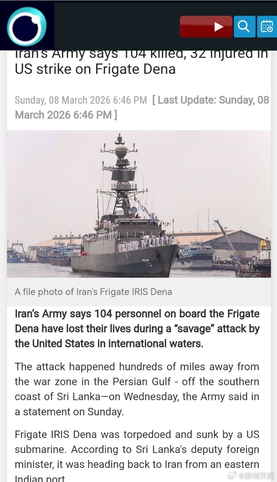 伊朗确认军舰遭美军击沉致104人死亡伊朗军方称,在国际水域,美国发动的“野蛮”袭击导致护卫舰上的 104 名人员丧生。