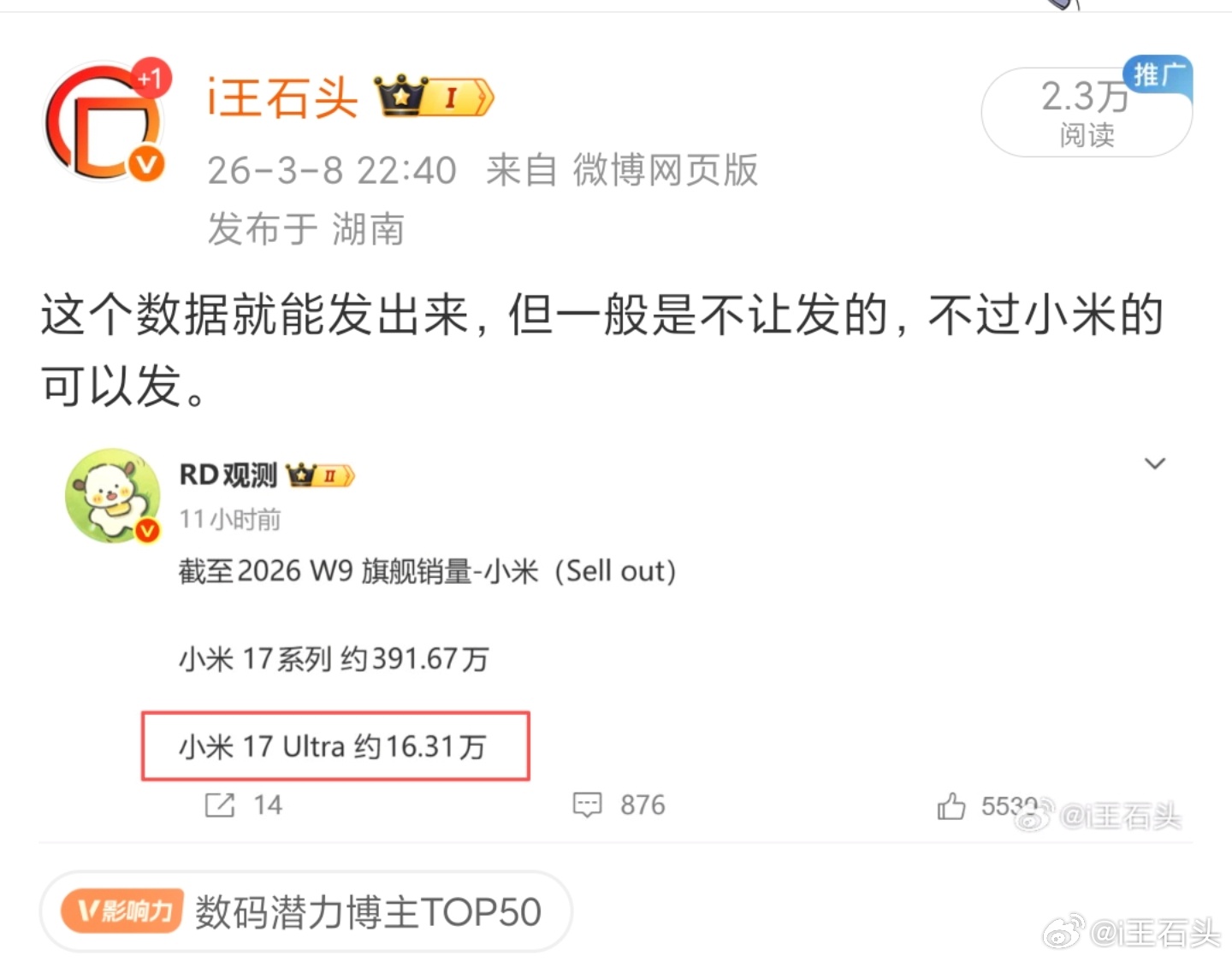 我不知道我发这么一条破防啥?就单纯说了一句小米的可以发,也没说别家的就不能发啊…其实这种单个型号的数据,小米的发了别家的不发本来就不行,厂商要投诉也就提交一个名单的事,因为发出来就会被带节奏。高端旗舰机各家都卖得差不多,看京东评论也能略知一二。而且小米17 Ultra也不是专为中国市场打造,徕卡版最近在海外确实还可以,日本很受欢迎,看到不少分享贴都是日本网友。
