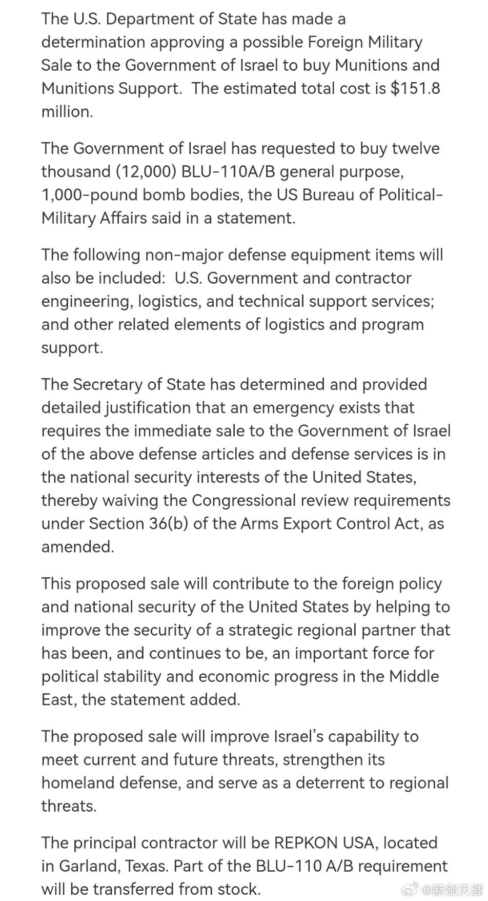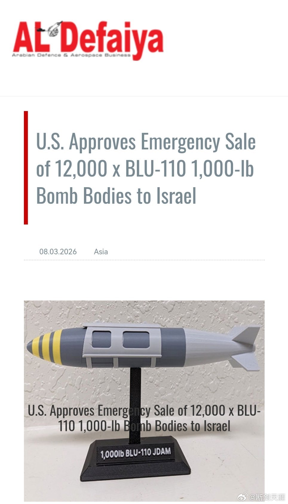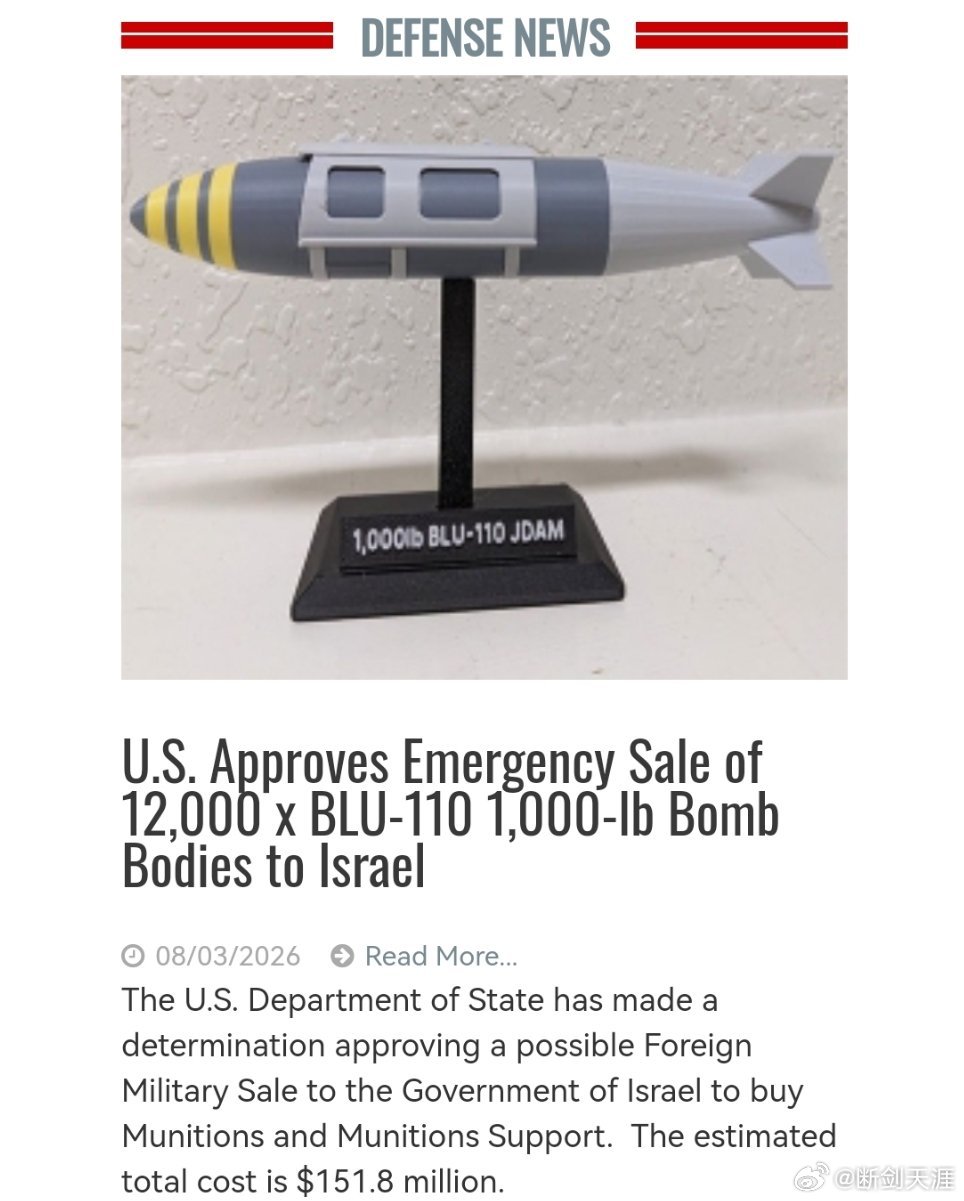 美国批准紧急向以色列出售 12000 枚 BLU-110 型 1000 磅炸弹本体。