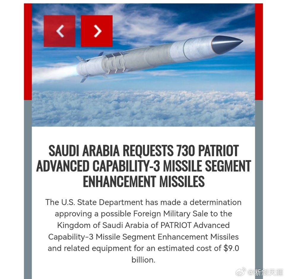 美伊以冲突 沙特阿拉伯请求购买 730 枚“爱国者先进能力 -3”导弹段增强型导弹