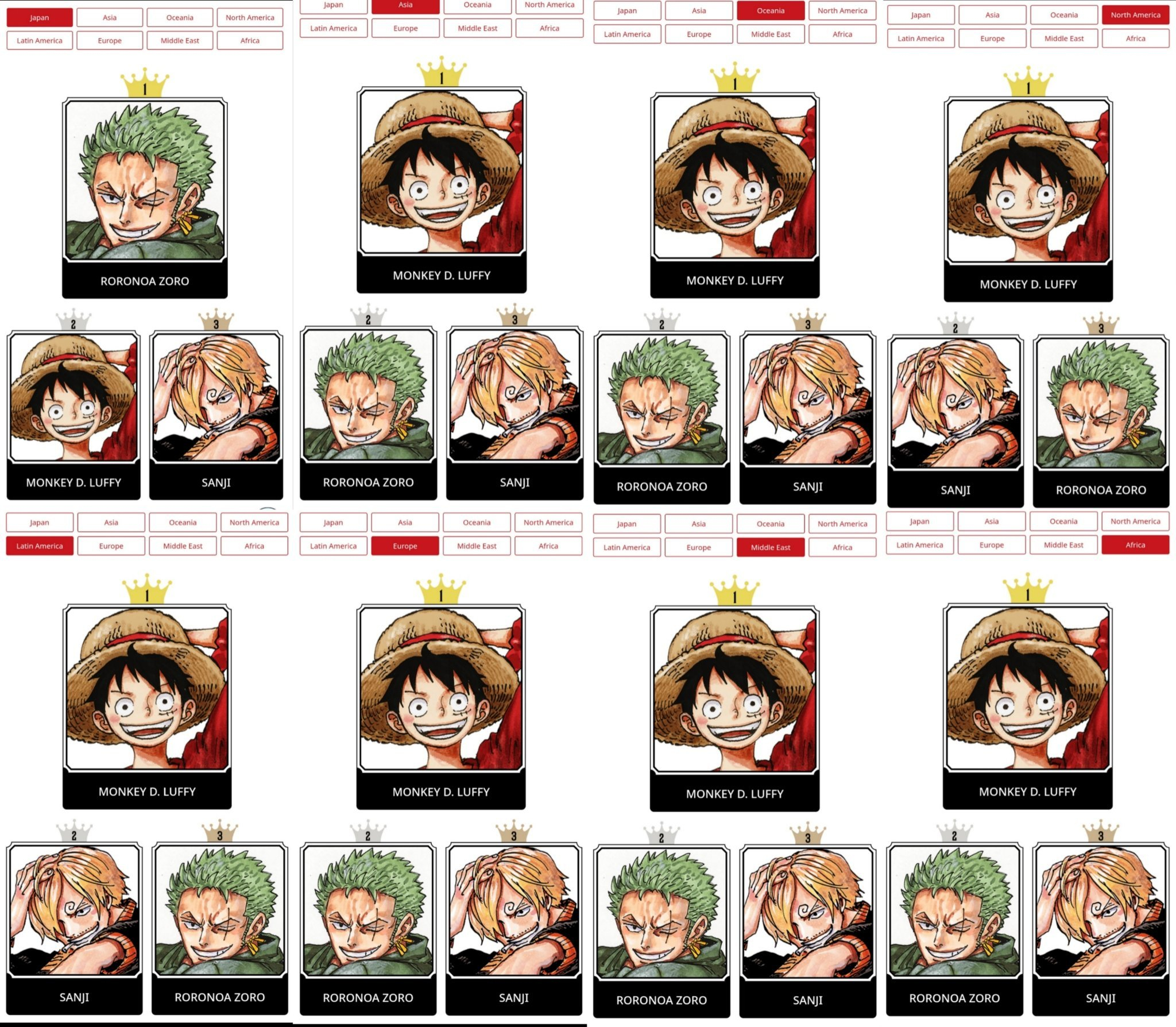 海贼王海贼王 一周过去了,来看看目前各个地区大家选出的TOP5吧!日本:①索隆②路飞③山治④罗⑤艾斯亚洲地区:①路飞②索隆③山治④娜美⑤艾斯大洋洲地区:①路飞②索隆③山治④罗⑤罗宾北美地区:①路飞②山治③索隆④罗宾⑤罗中南美地区:①路飞②山治③索隆④罗宾⑤罗欧洲地区:①路飞②索隆③山治④娜美⑤洛克斯中东地区:①路飞②索隆③山治④洛克斯⑤娜美非洲地区:①路飞②索隆③山治④洛克斯⑤香克斯