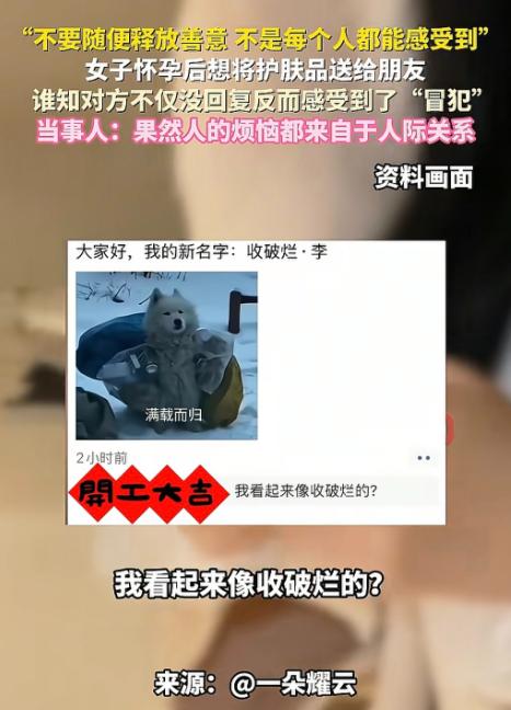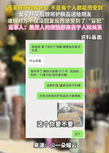 “敏感还是玻璃心?”辽宁,女子怀孕了,给朋友发信息,要把未使用的护肤品、卫生巾送给她,可朋友一直不回消息,女子却在15分钟后,看到朋友发了一条朋友圈配文:我看起来像收破烂的?女子瞬间憋闷:唉!果然人的烦恼都来自于人际关系! 辽宁沈阳的初春,午后的阳光透过飘窗洒在客厅的收纳箱上,怀孕12周的王女士正蹲在地上,仔细整理着近期用不上的东西。 她的动作很轻柔,生怕碰到腹部,手里拿起的是一套还没拆封的抗老精华,瓶身的包装完好无损,旁边堆着的是双十二囤货时多买的一箱卫生巾,同样是全新未拆,连外包装的塑封都没撕开。 怀孕后,王女士特意咨询了产科医生和皮肤科专家,得知孕期要严格避开视黄醇、水杨酸这类功效性成分,家里囤的好几款护肤品瞬间就成了“闲置品”。扔了觉得可惜,毕竟都是自己花大价钱买的正品,放着又担心过期浪费,她第一个想到的就是认识多年的朋友李女士。 两人平时关系不错,肤质也相近,李女士前段时间还在朋友圈吐槽护肤品用完了没来得及买,王女士觉得把这些全新的东西送给她,既解决了自己的闲置问题,也能帮朋友省一笔钱,算得上是两全其美的好事。 下午4点16分,王女士坐在沙发上,打开微信给李女士发了条消息。她没有直接说送东西,而是先问了句“你最近护肤品是不是用完了?”,等了两分钟没收到回复,又接着发了一段详细的说明,把自己的情况讲得很清楚:“我怀孕了,这些功效型的护肤品用不了,都是全新的,没拆封,还有一箱全新的卫生巾,你要是需要的话,下班咱们约个饭,我顺便带给你。” 怕朋友介意,她还特意补了一句:“都是全新的,你要是用着不合适,扔了也没关系,我就是觉得扔了太可惜。” 发送完消息,王女士把手机放在手边,起身去厨房准备水果。 她想着朋友可能在上班,没及时看手机很正常,心里还盘算着见面时要再叮嘱一句,护肤品的成分孕期不能用,平时用着没问题。她甚至已经想好了,要是朋友觉得不好意思,就说“反正我也用不上,你帮我解决了大麻烦”,让对方能安心收下。 15分钟的时间一晃而过,下午4点31分,王女士端着水果回到客厅,拿起手机想看看有没有回复。微信聊天框里依旧是她发出去的几条消息,没有任何回应。她下意识地打开朋友圈,却在刷新后的第一条,看到了李女士刚刚发布的动态。 那条朋友圈没有配图片,只有一行醒目的文字:“我看起来像收破烂的?”发布时间显示是4点30分,距离她发最后一条消息,刚过去14分钟。 看到这句话的瞬间,王女士手里的水果盘差点没端稳,心里猛地一沉,一股憋闷的情绪瞬间涌上心头。 她反复看着自己发的消息,又盯着那句朋友圈文案,哪怕心里想替对方找个借口,比如是说别人的,可时间点的巧合,让她无法自欺欺人。她坐在沙发上,愣了足足十几分钟,脑海里一遍遍回放着自己打字时的小心翼翼,那些怕朋友介意的顾虑,此刻都变成了笑话。 她不是没想过朋友可能会拒绝,毕竟每个人对护肤品的品牌、成分都有偏好,可她万万没想到,自己的一番好意,会被对方用“收破烂”这样的话来定义。 那些被她精心整理出来的全新物品,此刻仿佛也失去了价值,静静躺在收纳箱里,像是在无声地诉说着这场社交的尴尬。 王女士后来在自己的社交账号上分享了这件事,配文只有一句:“唉!果然人的烦恼都来自于人际关系!”这条分享很快引发了大量网友的关注和讨论。 有网友晒出自己类似的经历,说自己怀孕后把全新的孕妇奶粉送给闺蜜,却被对方嫌弃牌子不够高端;也有网友表示,自己曾把没拆封的婴儿衣服送给亲戚,对方却转手送给了别人,还说“反正也是送的”。 在母婴论坛和社交平台上,这类孕期闲置物品赠送引发的矛盾并非个例。 很多孕妈和王女士一样,怀孕后会囤积大量母婴用品和护肤品,一旦用不上,第一反应就是送给身边的人。她们的初衷大多是珍惜物品、分享善意,却往往忽略了对方的感受。 有网友留言说,自己并不介意接受朋友的闲置,但讨厌对方“扔了可惜才给你”的语气;也有网友表示,被人突然送东西,会觉得像是在“被施舍”,心里会不舒服。 事件发酵后,王女士没有再主动联系李女士,李女士也始终没有回复她的消息,那条朋友圈后来被李女士删除了,两人的关系也变得微妙起来。 王女士后来把那些护肤品和卫生巾,通过社区公益组织,捐赠给了有需要的单亲妈妈和孕期女性,对方收到后,特意给她发了感谢信,还拍了照片,告诉她这些东西帮了大忙。 收到感谢信的那一刻,王女士心里的憋闷消散了大半。她把感谢信截图保存下来,在社交账号上更新了一条动态,分享了捐赠的经历。 她没有再提及和李女士的矛盾,只是说,善意应该被放在合适的地方,也应该被懂得的人接收。这条动态下,有很多网友留言表示支持,有人说,善意的传递需要双向的尊重,也有人说,社交里的边界感,比善意更重要。