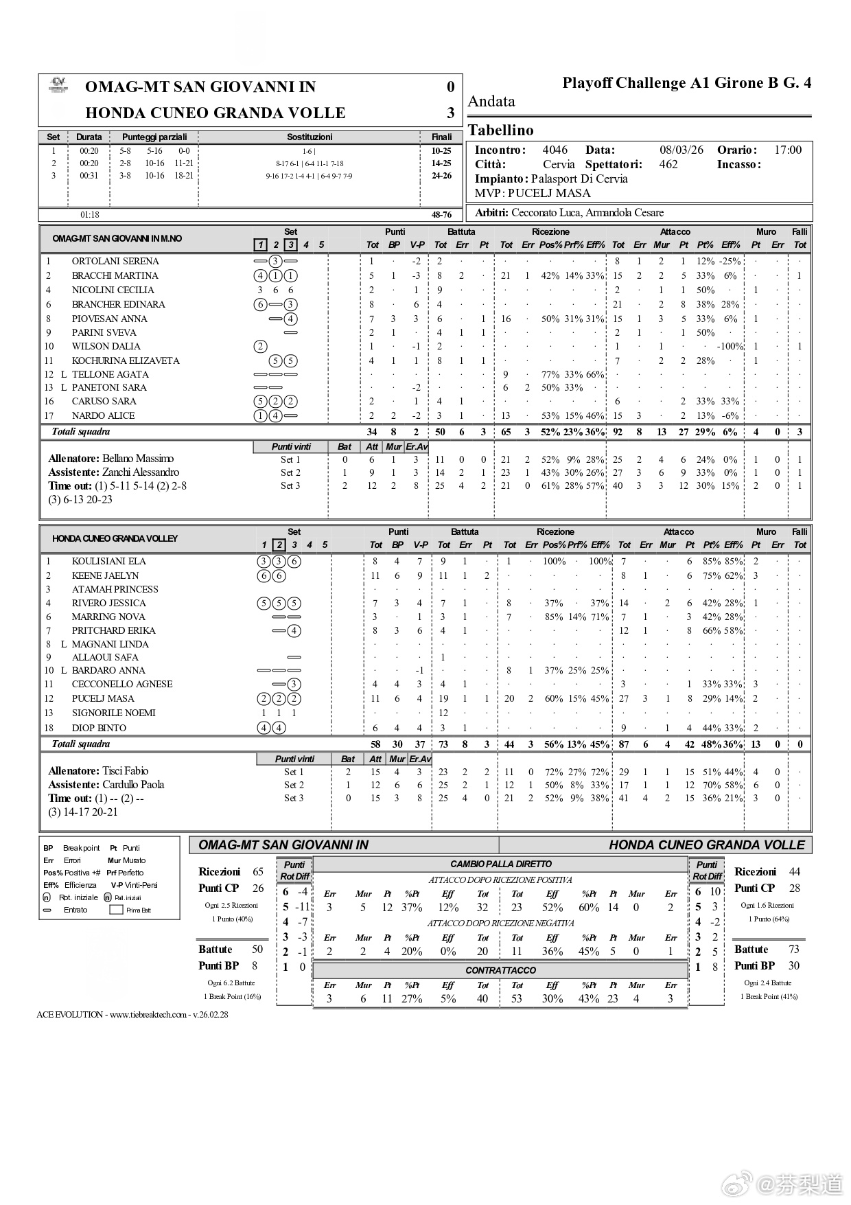 国际排坛动态意甲女排联赛5-12名排位赛:圣乔瓦尼0-3(10-25/14-25/24-26)库内奥雨刷一走,圣乔瓦尼队全场得分都没有上双的了,即将加盟科内利亚诺的皮奥韦桑7分15扣5中1失误3被拦 1拦1分