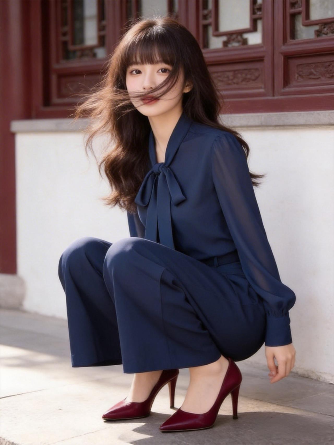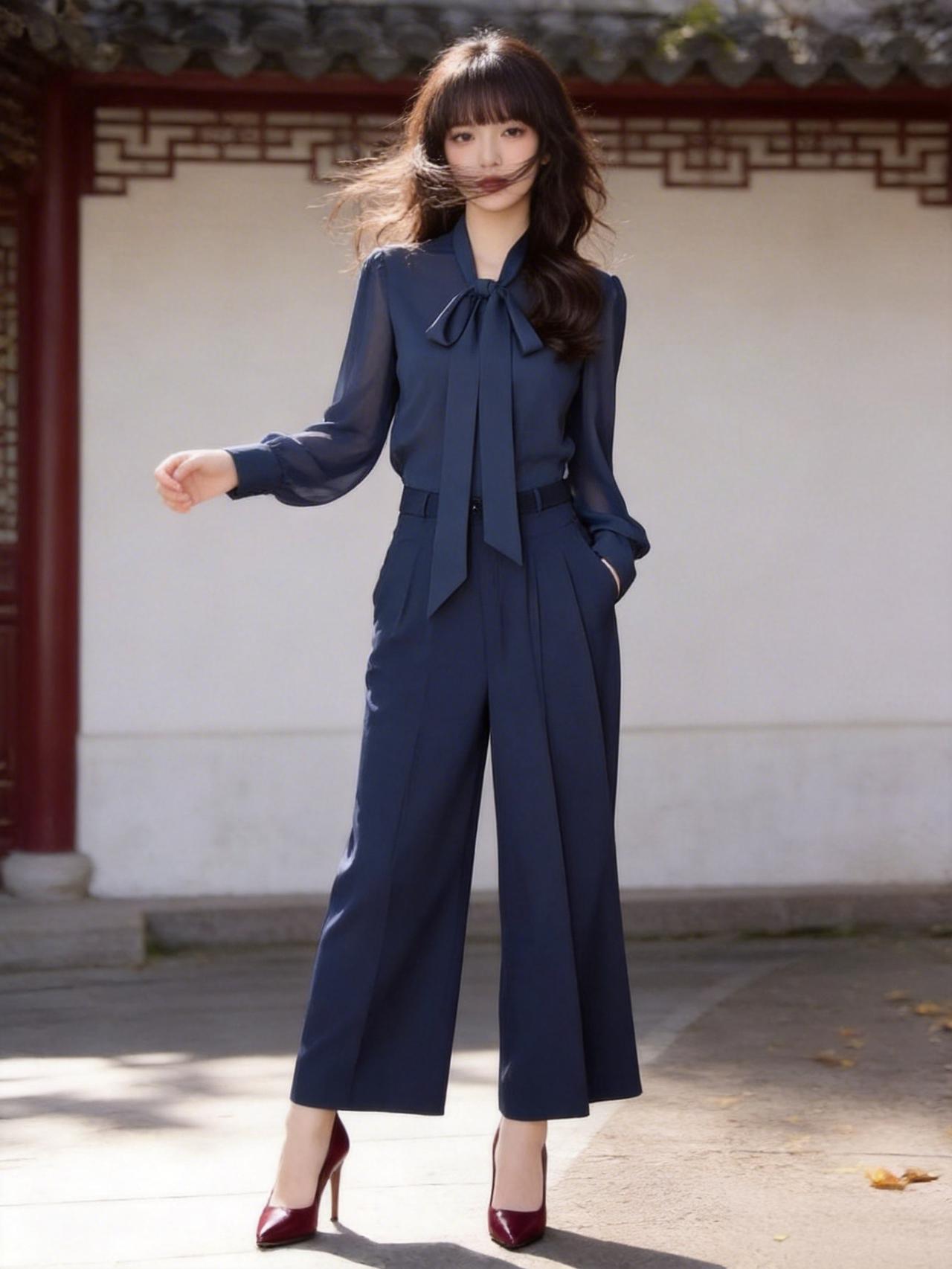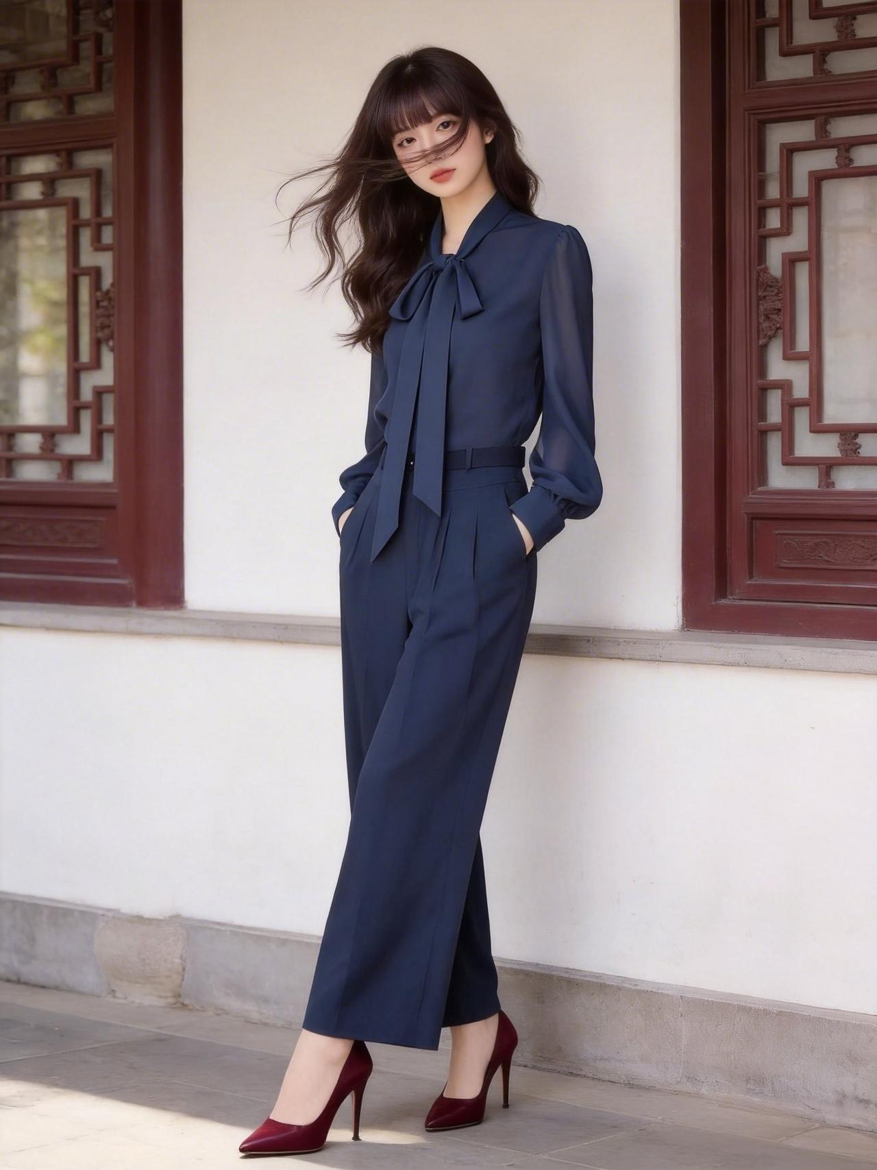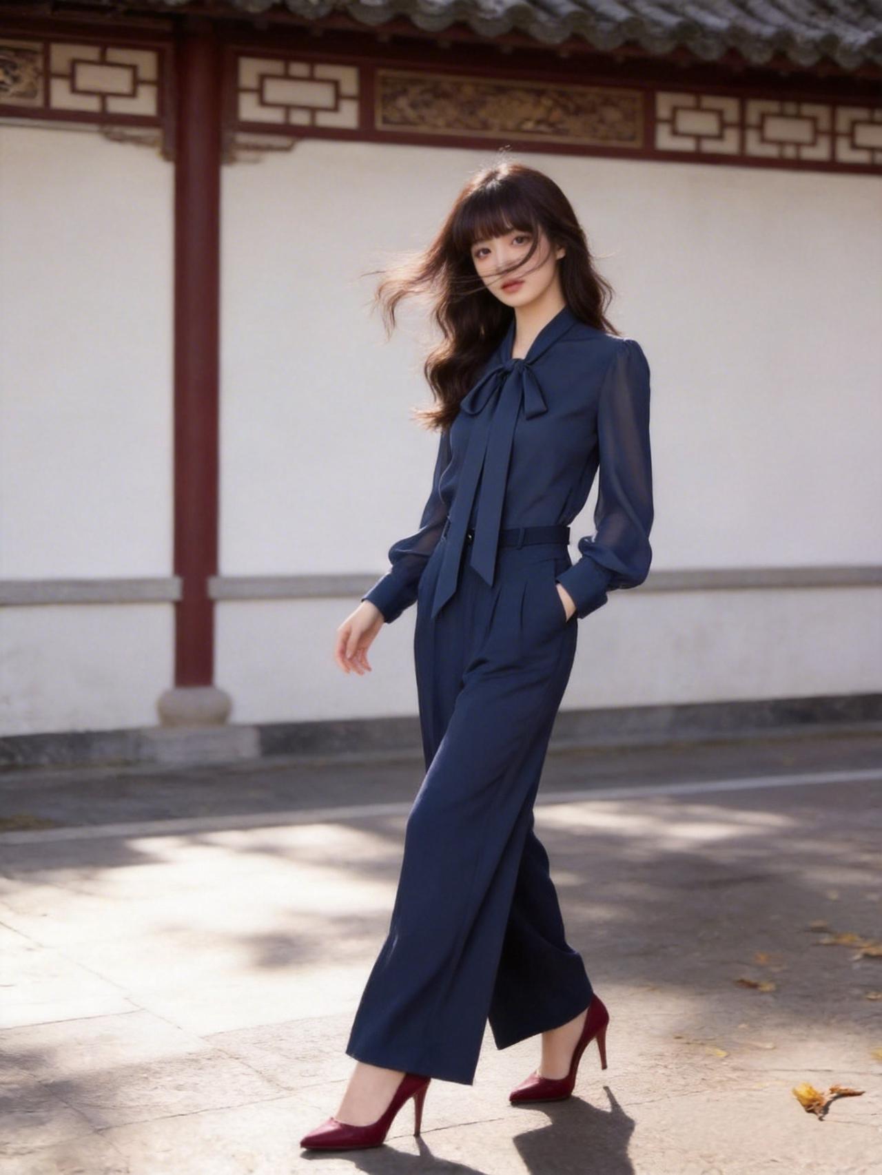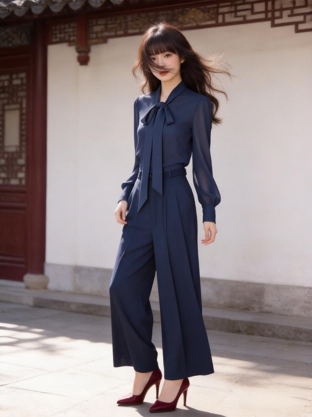 优雅的蓝色连体裤,配上红色高跟鞋,在古色古香的建筑前拍了照,感觉自己美美哒!蓝色阔腿裤穿搭