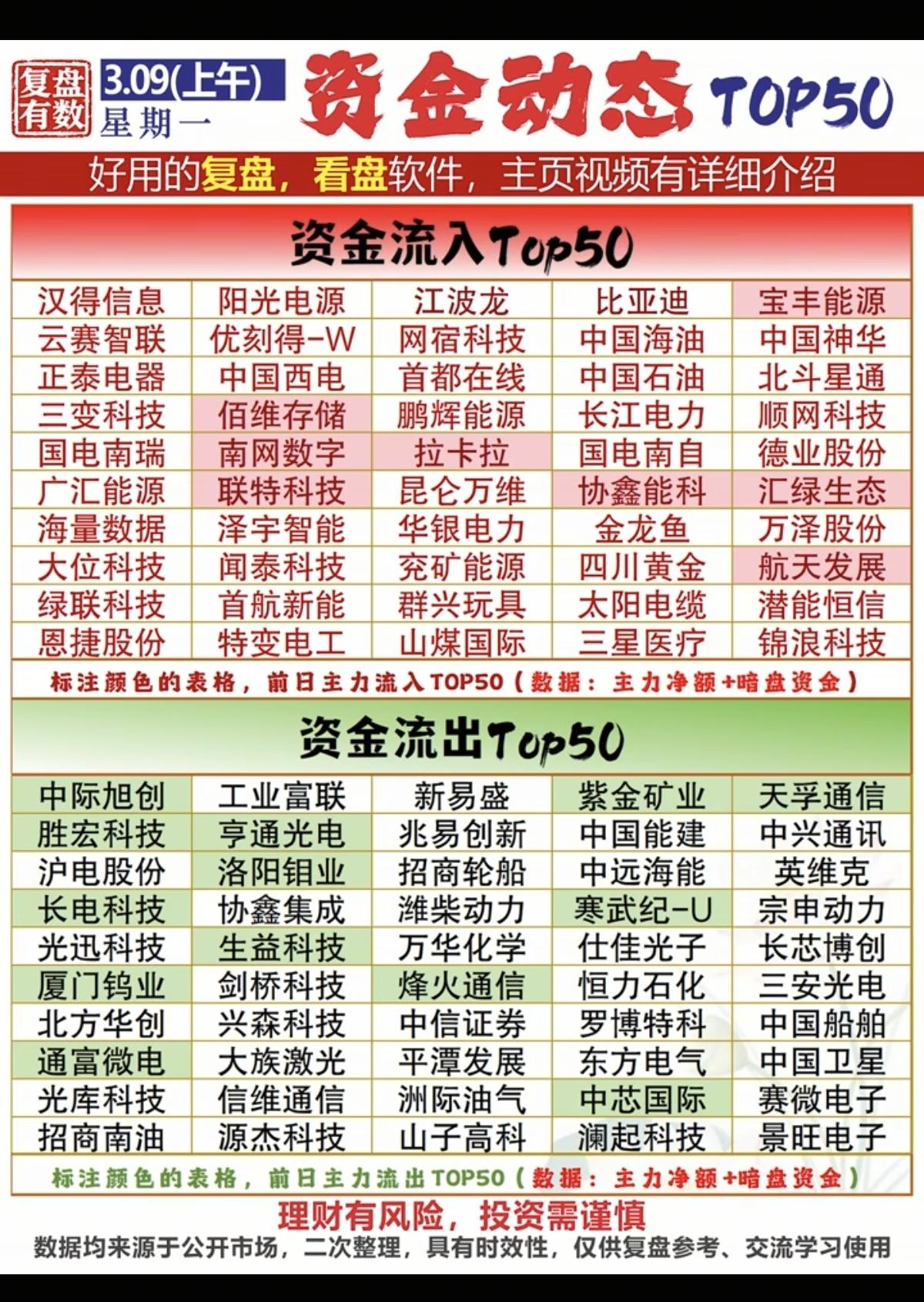 3.9周一 主力资金 抢筹出逃个股榜! 资金抢筹: 1.资源开采 2.油气油服 3.海运航运 4.煤炭,煤化工 5.燃气 资金出逃:电子元件、小金属、通信设备、半导体、电子化学品等
