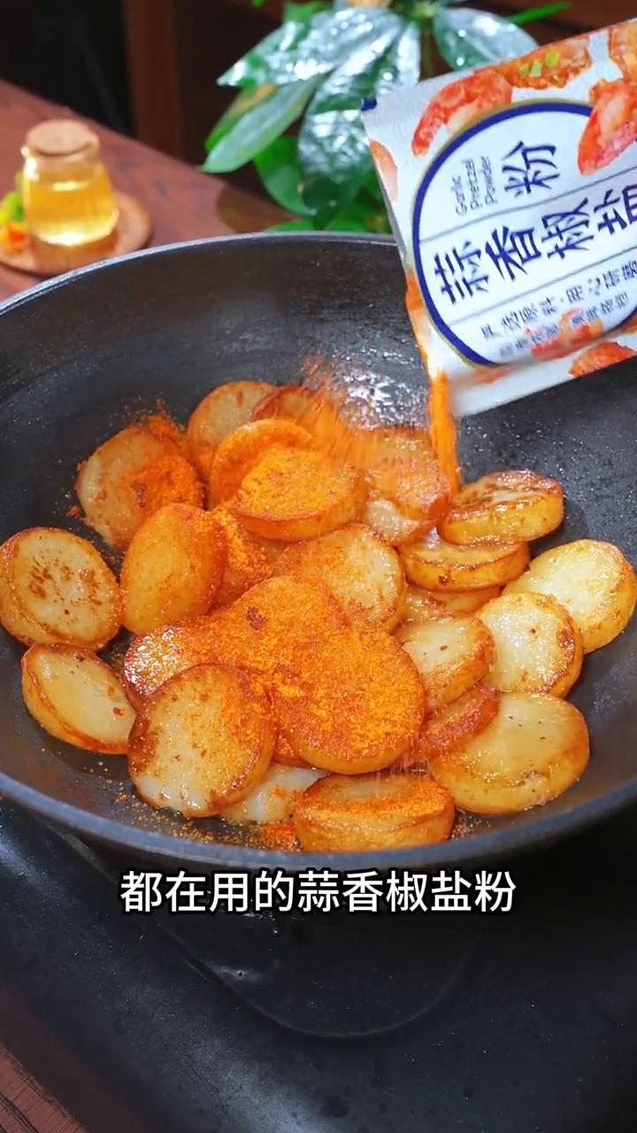 椒盐土豆。 家人们注意看,我两个女儿从小就特别喜欢吃土豆,今天闺蜜教会了我一个土豆的神仙吃法,焦香美味,好吃又下饭。 ·树上摘来的土豆切成厚一点的薄片,倒入清水洗去表面多余的淀粉,这样做出来会更加入味好吃。 ·水开上锅蒸10分钟。 ·锅中油热倒入土豆,中小火煎至表面微微焦黄。 ·好吃的关键就是撒上酒店大厨都在用的蒜香椒盐粉,开大火翻炒均匀,最后撒上一把葱花即可出锅。 这样做的椒盐土豆焦香美味,一上桌我家三个女儿都抢着吃,保存起来你也试试。 不知道蒜香椒盐粉在哪里的朋友可以点我头像。