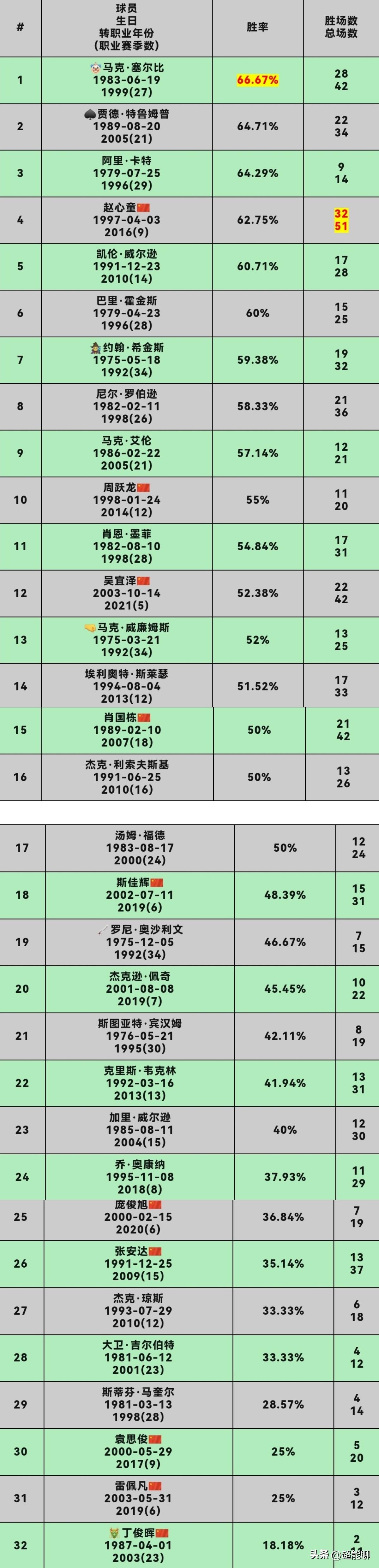 有数据统计了本赛季前32球员之间的交手胜率,赵心童遇到51场胜了32场,胜率62.75%排在第四,小特遇到34场胜了22场,胜率64.71%排在第二。 而排名第一的是塞大师,遇到42场胜了28场,胜率高达66.67%,这也是塞大师状态复苏的强力表现。 中国其他球员里胜率超过50%的还有周跃龙(55%),吴宜泽(52.38%)肖国栋(50%)。而近来状态不佳的丁主任则在32人中胜率最低,只有18.18%。当然其中一个原因是他参加的比赛太少了,也希望他能尽快调整状态回归!