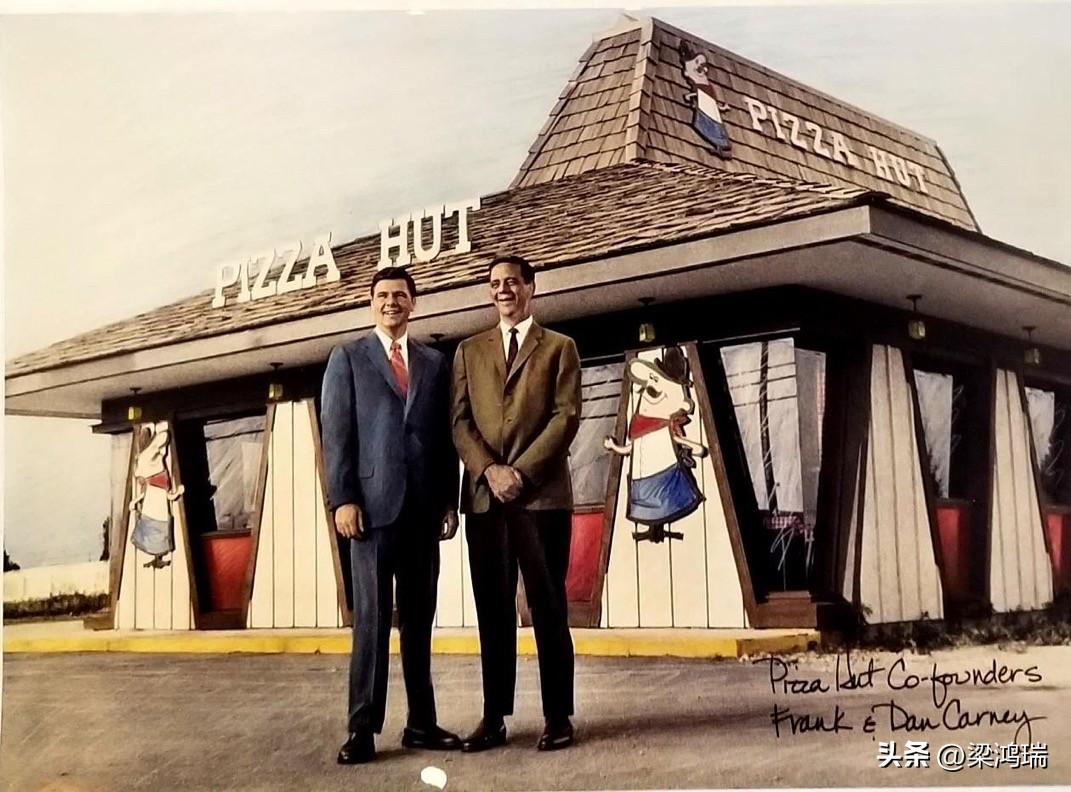 必胜客的联合创始人是弗兰克·卡尼和丹·卡尼兄弟,拍照时间是上世纪70年代。1958年,兄弟俩用从母亲那里借来的600美元创办了必胜客。他们购买了二手设备,并在堪萨斯州威奇托市一个繁忙的十字路口租了一栋小楼。这对兄弟当时因为招牌位置有限,只能容纳 8个字母,于是结合建筑的外形和产品,才取名为“Pizza Hut”。