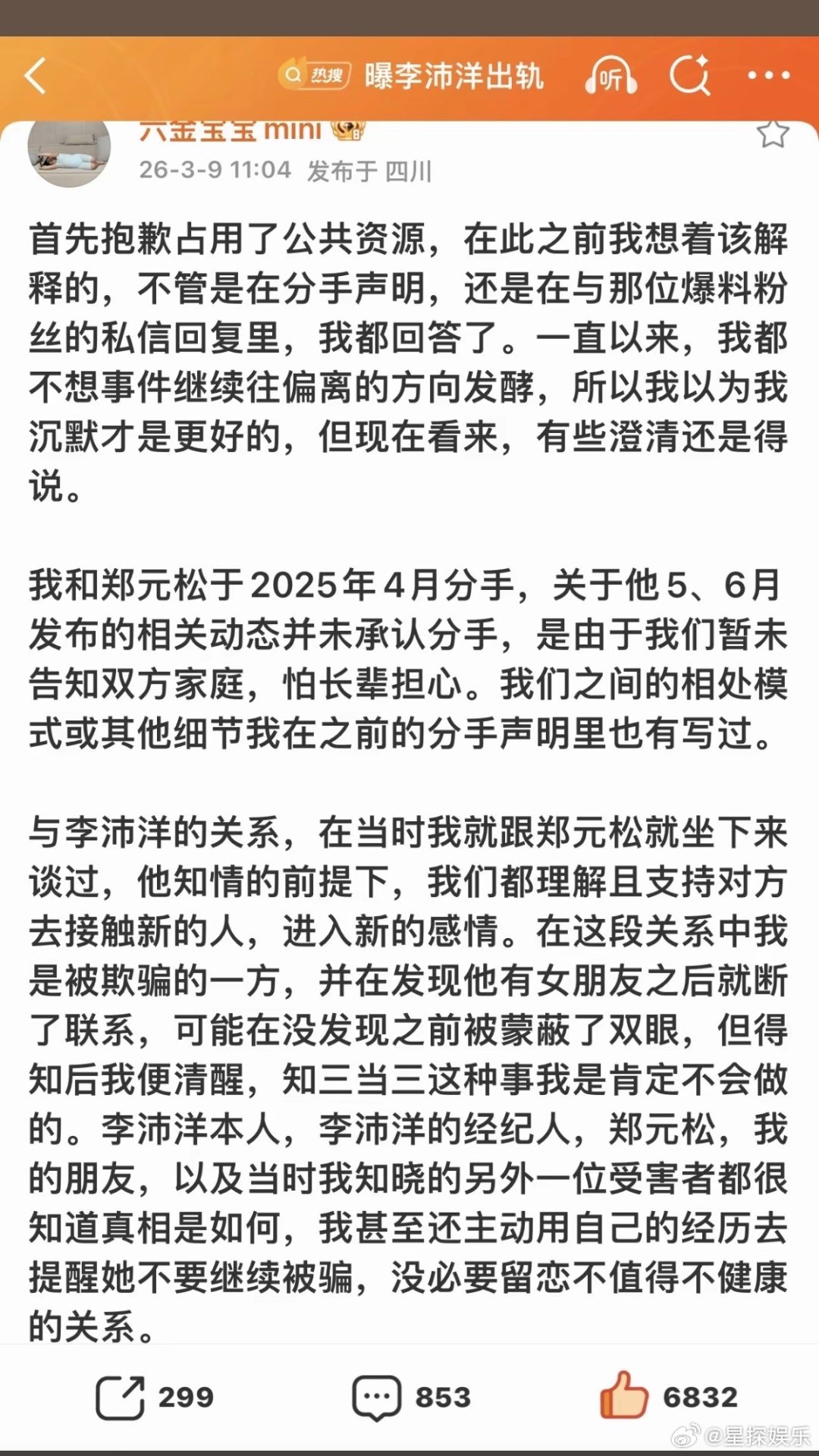 六金发文六金这篇长文看下来,最绕的还是时间线啊。一边说2025年4月就分了,一边前任5月还发520合照、8月说没分手,这同居不公开的设定也太迷了。李沛洋那边更绝,被锤了9月后还在周旋,本人却全程隐身,只有经纪人私下删帖。现在各说各的,缺的就是完整聊天记录这种实锤。短剧圈的瓜,果然比正剧还跌宕。