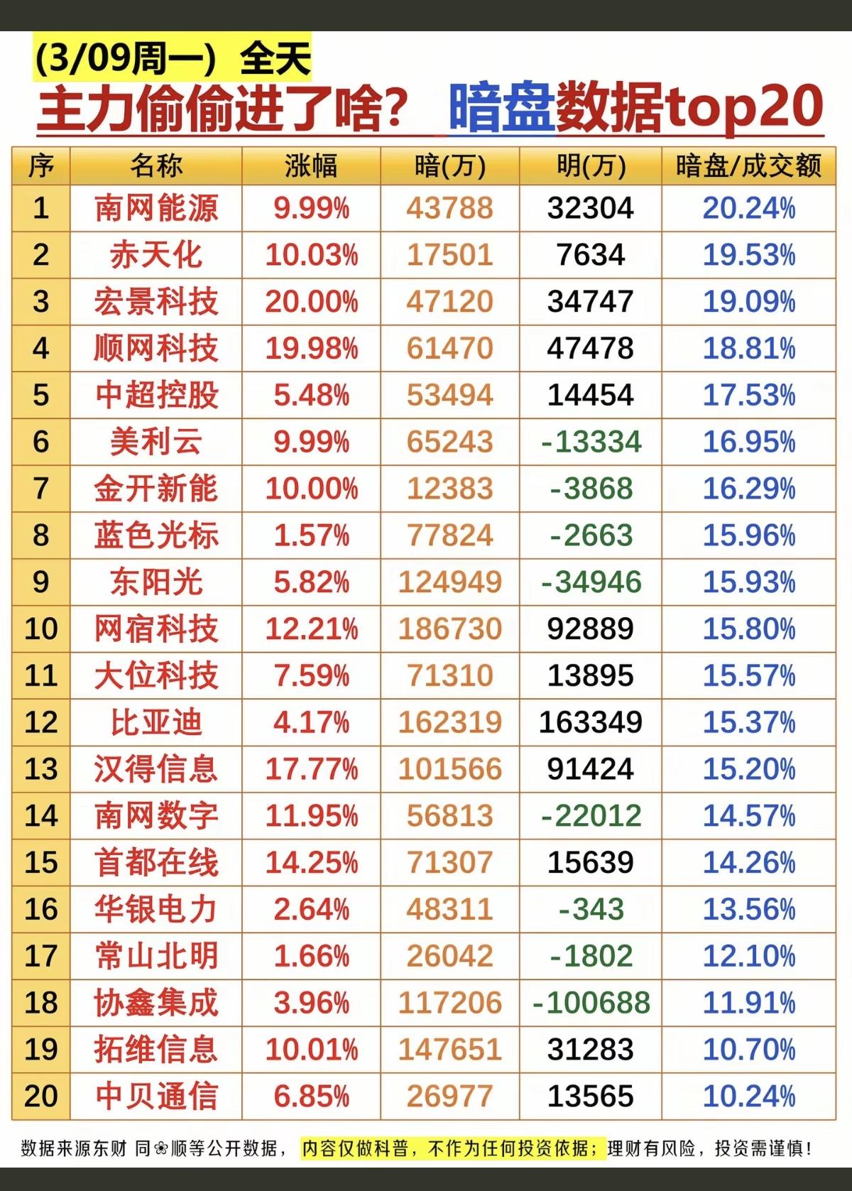 3.9周一 主力偷偷买了啥?暗盘数据TOP20! 1.油气油服 2.新能源车 3.人工智能AI应用 4.龙虾智能体 5.数字货币 6.存储芯片,算力
