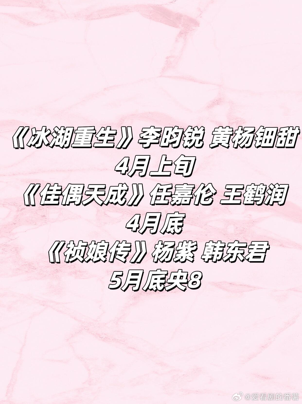 电视剧部分排播《冰湖重生》李的锐 黄杨细甜4月上旬《佳佛天成》任嘉伦王鹤海4月底《按娘传》杨紫 韩冻君5月底央8