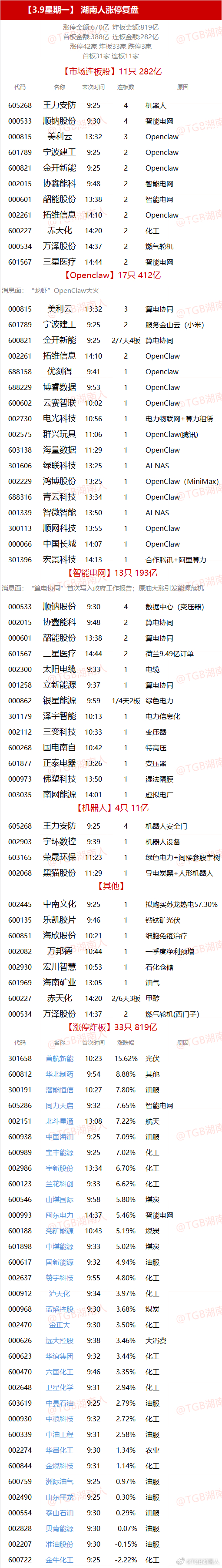 【3.9星期一】 湖南人涨停复盘 "涨停金额:670亿 炸板金额:819亿首板金额:388亿 连板金额:282亿涨停42家 炸板33家 跌停3家首板31家 连板11家" 【市场连板股】11只 282亿 代码 名称 末次时间 连板数 原因605268 王力安防 9:25 4 机器人000533 顺钠股份 9:30 4 智能电网000815 美利云 13:32 3 Openclaw601789 宁波建工 9:25 2 Openclaw600821 金开新能 9:25 2 Openclaw002015 协鑫能科 9:48 2 智能电网000601 韶能股份 13:38 2 智能电网002261 拓维信息 14:10 2 Openclaw600227 赤天化 14:20 2 化工000534 万泽股份 14:37 2 燃气轮机601567 三星医疗 14:44 2 智能电网【Openclaw】17只 412亿 消息面:“龙虾”OpenClaw大火 000815 美利云 13:32 3 算电协同601789 宁波建工 9:25 2 服务金山云(小米)600821 金开新能 9:25 2/7天4板 算电协同002261 拓维信息 14:10 2 OpenClaw688158 优刻得 9:41 1 Openclaw688229 博睿数据 9:53 1 OpenClaw600602 云赛智联 10:02 1 OpenClaw002730 电光科技 10:56 1 电力物联网+算力租赁002575 群兴玩具 11:06 1 OpenClaw(腾讯)603138 海量数据 11:29 1 OpenClaw301606 绿联科技 13:25 1 AI NAS002229 鸿博股份 13:25 1 OpenClaw(MiniMax)688316 青云科技 13:34 1 OpenClaw001339 智微智能 13:50 1 AI NAS300113 顺网科技 13:55 1 OpenClaw000066 中国长城 14:07 1 OpenClaw301396 宏景科技 14:13 1 合作腾讯+阿里算力【智能电网】13只 193亿 消息面:“算电协同”首次写入政府工作报告;原油大涨引发能源危机 000533 顺钠股份 9:30 4 数据中心(变压器)002015 协鑫能科 9:48 2 算电协同000601 韶能股份 13:38 2 算电协同601567 三星医疗 14:44 2 荷兰9.49亿订单002300 太阳电缆 9:33 1 电缆001258 立新能源 9:37 1 算电协同000862 银星能源 9:59 1/4天2板 绿色电力301179 泽宇智能 10:13 1 电力信息化002112 三变科技 10:33 1 变压器600268 国电南自 10:42 1 特高压601877 正泰电器 13:26 1 变压器000973 佛塑科技 13:50 1 湿法隔膜003035 南网能源 14:01 1 虚拟电厂【机器人】4只 11亿 605268 王力安防 9:25 4 机器人安全门002903 宇环数控 9:39 1 机器人设备603165 荣晟环保 11:23 1 绿色电力+间接参股宇树002068 黑猫股份 11:29 1 导电炭黑+人形机器人【其他】 002445 中南文化 9:25 1 拟购买苏龙热电57.30%600135 乐凯胶片 9:46 1 钙钛矿光伏600851 海欣股份 10:21 1 细胞免疫治疗002082 万邦德 10:44 1 一季度净利预增002930 宏川智慧 10:53 1 石化仓储601969 海南矿业 13:05 1 油气600227 赤天化 14:20 2/6天3板 甲醇000534 万泽股份 14:37 2 燃气轮机(西门子)【涨停炸板】33只 819亿 代码 名称 首次时间 涨跌幅 原因301658 首航新能 10:23 15.62% 光伏600812 华北制药 9:54 8.88% 其他300191 潜能恒信 10:27 7.80% 油服605286 同力天启 9:32 7.65% 智能电网002151 北斗星通 13:08 7.22% 航天600938 中国海油 9:25 7.09% 油服600989 宝丰能源 9:25 7.02% 化工002986 宇新股份 13:34 6.70% 化工600123 兰花科创 9:33 6.62% 化工600546 山煤国际 9:58 5.80% 煤炭000993 闽东电力 14:37 5.46% 智能电网600188 兖矿能源 10:43 5.19% 煤炭601898 中煤能源 9:33 5.02% 煤炭600617 国新能源 9:32 4.94% 油服002637 赞宇科技 9:55 4.80% 化工000912 泸天化 9:34 3.97% 化工000968 蓝焰控股 9:30 3.68% 煤炭002470 金正大 9:30 3.50% 化工000626 远大控股 9:38 3.46% 大消费600623 华谊集团 9:32 3.44% 化工600470 六国化工 9:46 3.35% 化工002648 卫星化学 9:31 2.94% 化工603619 中曼石油 9:25 2.79% 油服000930 中粮科技 9:32 2.72% 化工600339 中油工程 9:31 2.58% 油服002274 华昌化工 9:30 1.34% 农业600844 金煤科技 9:31 1.14% 化工600759 洲际油气 9:25 0.97% 油服002490 山东墨龙 9:25 0.30% 油服000554 泰山石油 9:30 0.29% 油服002828 贝肯能源 9:30 -0.07% 油服002207 准油股份 9:30 -0.15% 油服600722 金牛化工 9:25 -2.22% 化工