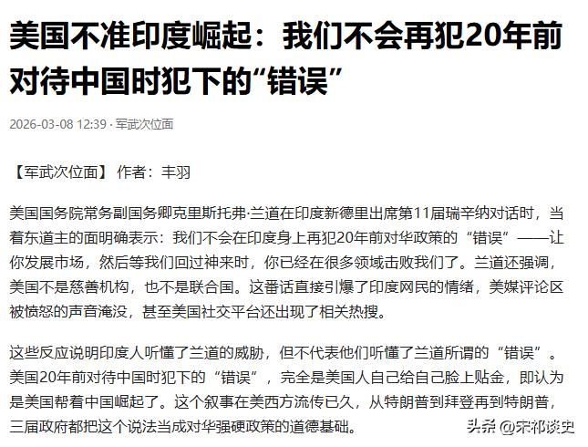 美国摊牌了!绝不许印度成第二个中国,这番话彻底戳破美式霸权 美国高官当着印度的面放狠话:绝不会在印度身上,重犯20年前对华的“错误”。 不会让印度在商业领域击败美国,还直言美国不是慈善机构!这番话直接激怒印度网民,也彻底撕下了美国的伪装! 美国所谓的“对华错误”,纯属自欺欺人。 中国入世是多年艰苦谈判的结果,绝非美国施舍,美国当初只是想打开中国市场、转移低端产能,还一直对华搞技术封锁。 中国能崛起,全靠自己艰苦奋斗、自主攻关,不是美国“养”出来的。 美国对印度,一边想拉拢其制衡中国,一边又严防印度变强,只把印度当棋子。 既想让印度听话,又不肯给核心技术、绝不允许印度崛起。美印所谓的合作,本质是美国用利益捆绑印度,遏制其工业化进程。 印度想复制中国崛起路,却没有中国的战略定力和工业基础,一味依附美国,最终只会沦为霸权工具。 国际关系从来只有利益,美国的算计,终究是搬起石头砸自己的脚!
