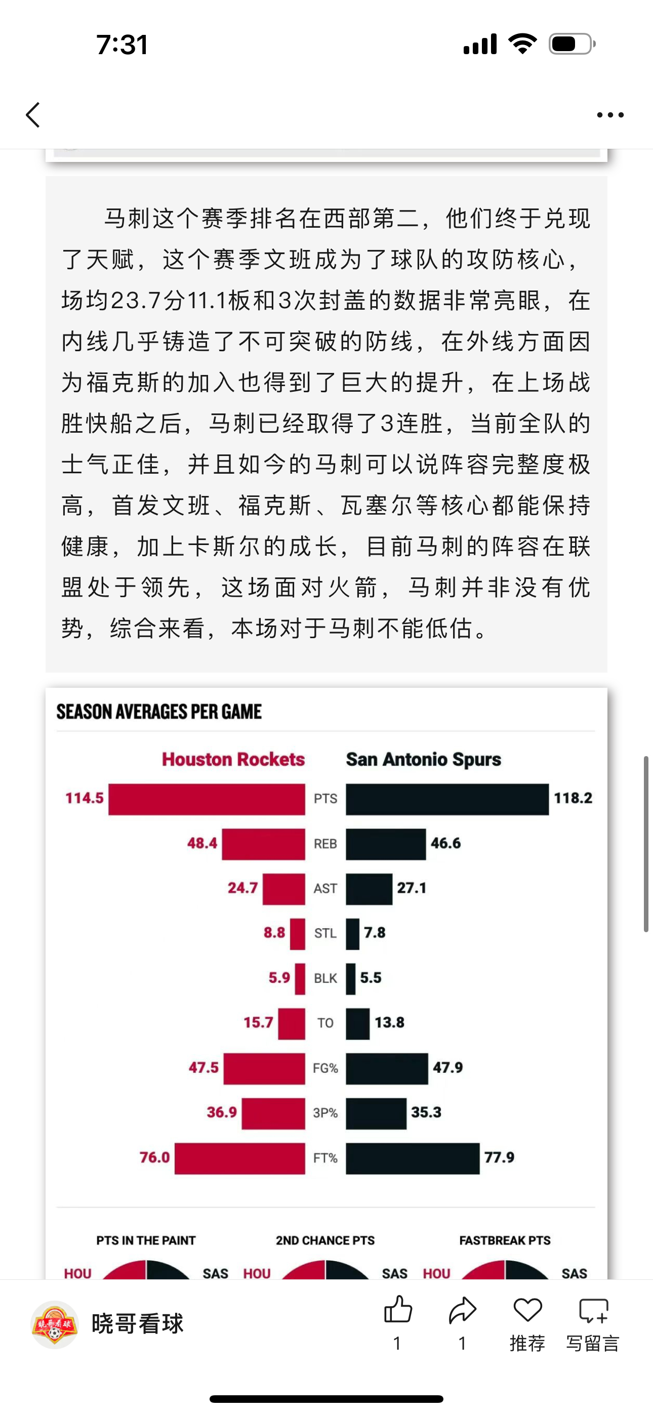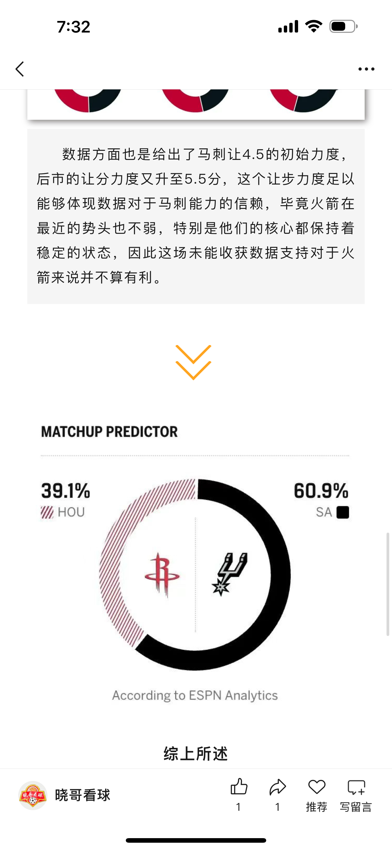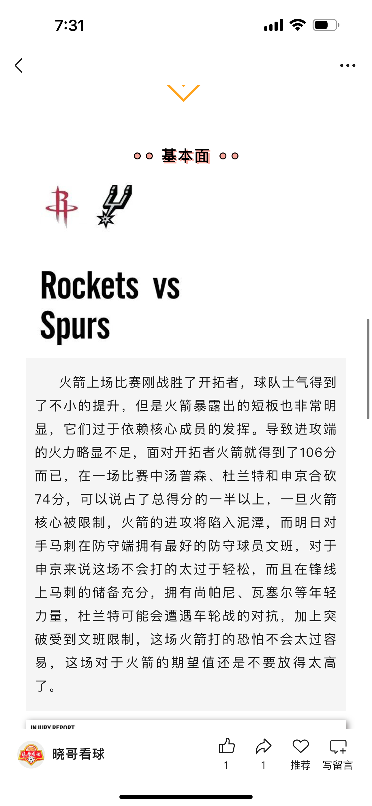 昨日公推马刺收获好评成绩,这场比赛对于马刺的分析还是比较精准,我说过他们当前的势头正盛,而且面对火箭球队在内线不会吃亏,加上火箭非常依赖个人能力,对上整个位置都非常均衡的马刺自然是打的非常艰难,这场马刺好评合理!篮球预测nba马刺火箭体彩