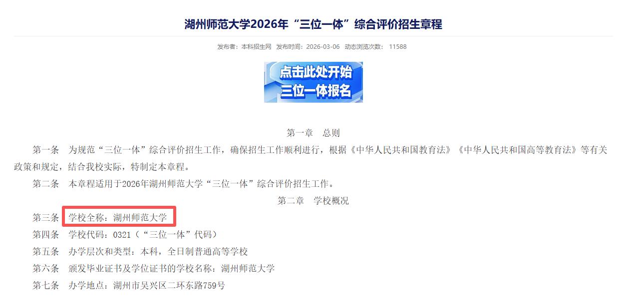 太好了!湖州师范学院正式更名为湖州师范大学! 3 月 6 号,学校发布 2026 年 “三位一体” 招生章程,第一次以新校名 “湖州师范大学” 对外招生,毕业证、学位证也全部换新名字! 湖州师范大学的办学历史可追溯至1916年的钱塘道第三联合县立师范讲习所,1958年开始高等教育,1994年开始招收本科生,1999年原湖州师范专科学校、湖州师范学校和湖州教师进修学院合并成立湖州师范学院,2000年原湖州卫生学校并入湖州师范学院。 经过多年的努力,湖州师范学院终于更名为湖州师范大学了。 目前,东校区西门正在更换新校名牌子,现场已在安装 “湖州师范大学” 新招牌! 从 “学院” 到 “大学”,湖州高等教育再上一个台阶! 恭喜所有师生,未来可期!