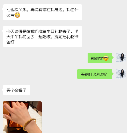 看到实盘朋友用投资赚到的钱给家人买礼物,我从心底由衷的开心。你们的行动证明了童哥我的实力,同时也说明童哥我的团队充满温馨和爱的避风港。正所谓百善孝为先,实盘好友的做法值得我们很多人学习。